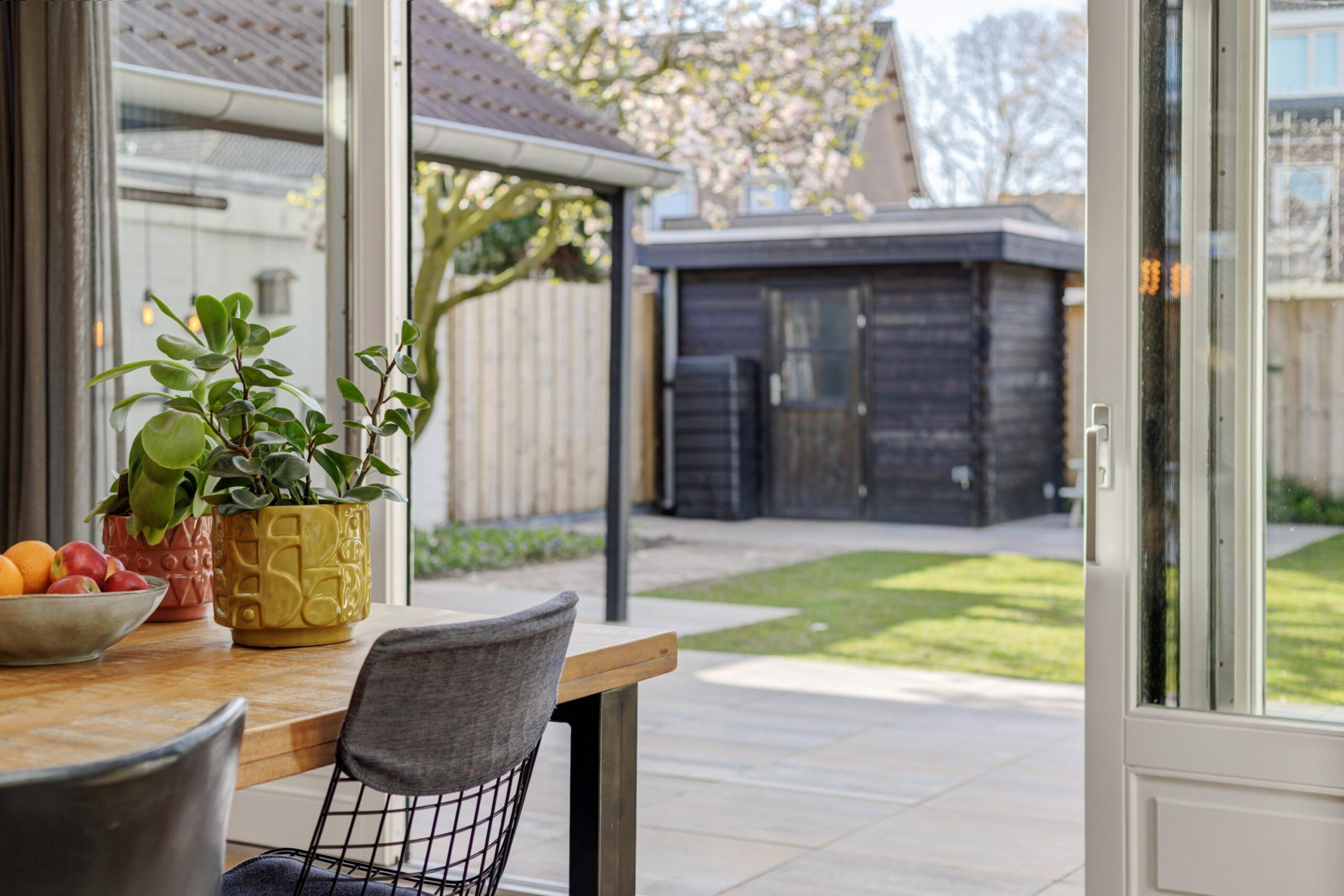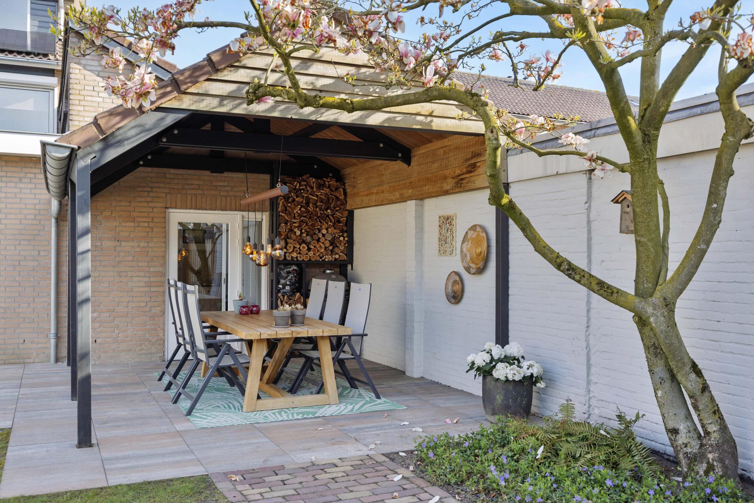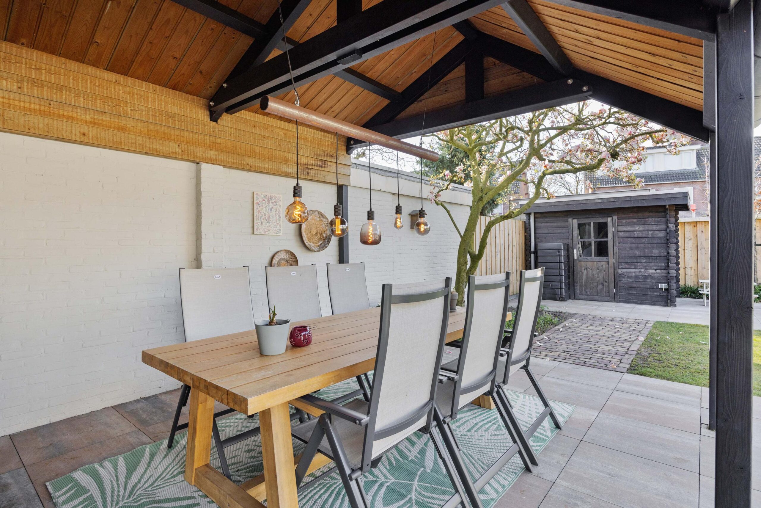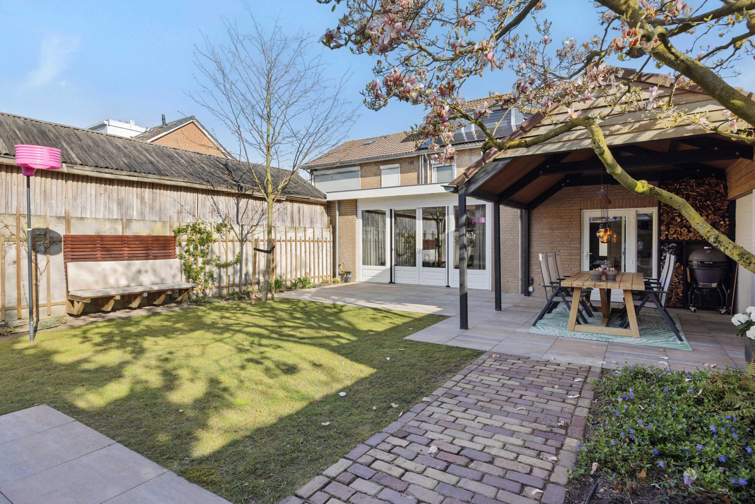 De achtertuin is in 2023 opnieuw aangelegd met diverse terrassen, een gazon, plantenbordes en een fijne overkapping die bereikbaar is via de bijkeuken. Hier kun je al vroeg in het jaar van het buitenleven genieten. Achterin de tuin staat een houten tuinhuis en de leibeuken en bomen, zoals een prachtige magnolia, zorgen voor extra privacy en sfeer. De voortuin en oprit zijn in 2025 nieuw aangelegd. Zowel de voor- als achtertuin zijn voorzien van een handige sproei- en beregeningsinstallatie, zodat de tuin er altijd top bij staat.