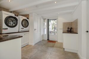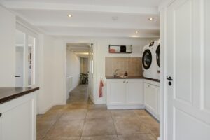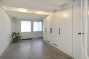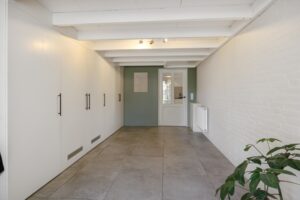 Vanuit de uitbouw bereik je de praktische bijkeuken met het toilet, witgoedaansluitingen en een extra keukenblok. De voormalige garage is nu een volledig geïsoleerde berging met maatwerkkasten. Heb je extra spullen? Boven de gehele oppervlakte van de garage én de bijkeuken bevindt zich een zeer ruime bergzolder, bereikbaar via een luik.