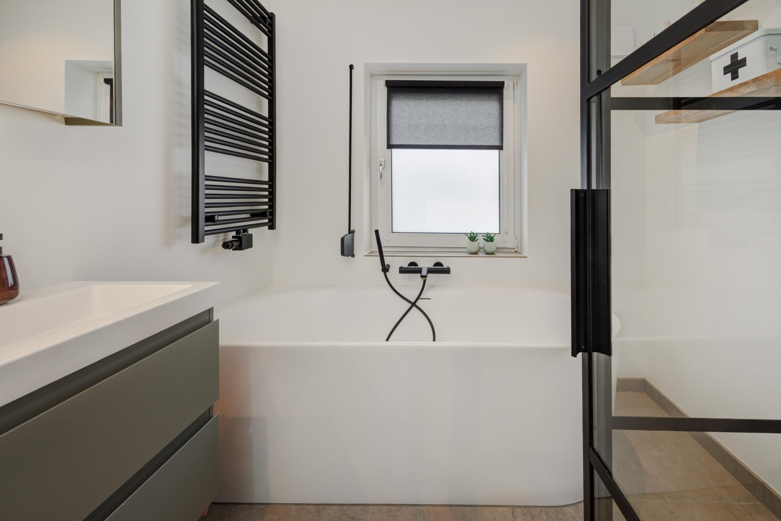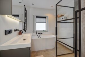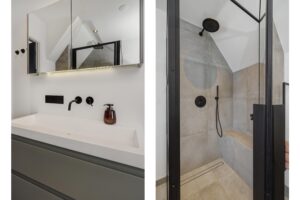 Op de eerste verdieping vind je twee ruime slaapkamers (voorheen drie). De kamer aan de voorzijde beschikt over een royale inloopkast. De luxe badkamer (5 jaar oud) is een heerlijke plek om te ontspannen met een ligbad, inloopdouche met Easy Drain, een breed wastafelmeubel en stijlvolle wandkranen. De verdieping is strak afgewerkt met stucwerk en een laminaatvloer, en overal ben je voorzien van horren en rolluiken. De kozijnen op deze verdieping zijn van onderhoudsvriendelijk kunststof (m.u.v. het raam in de inloopkast).