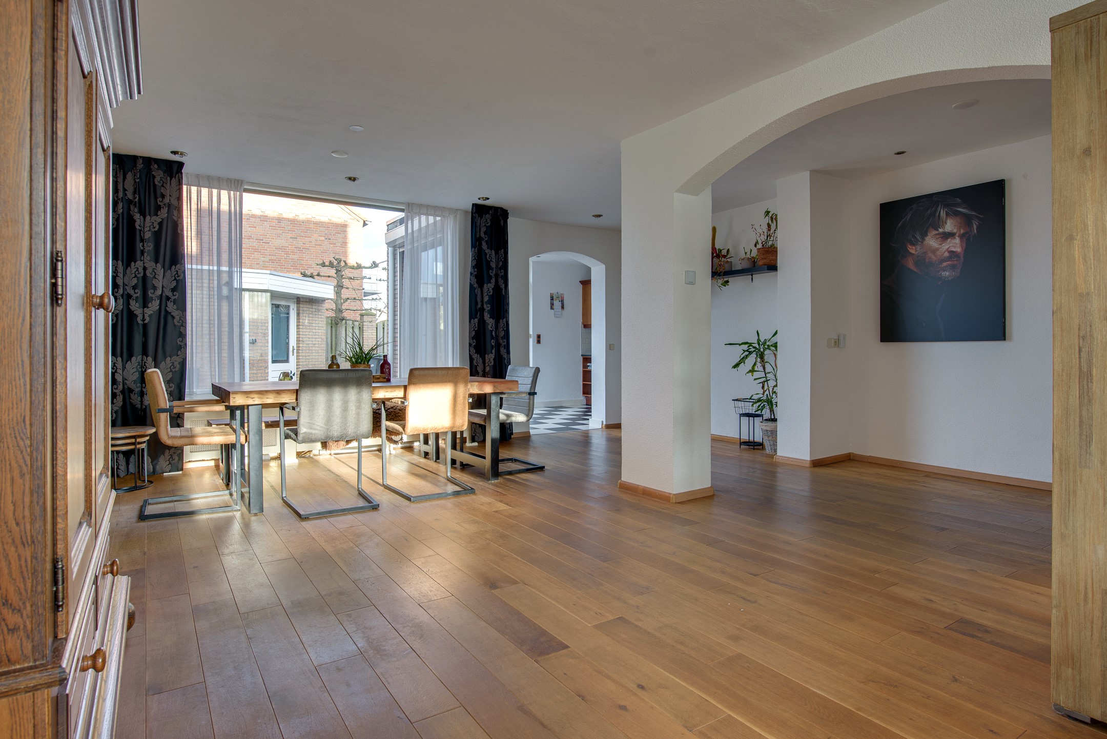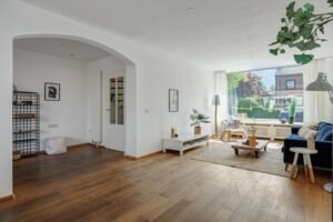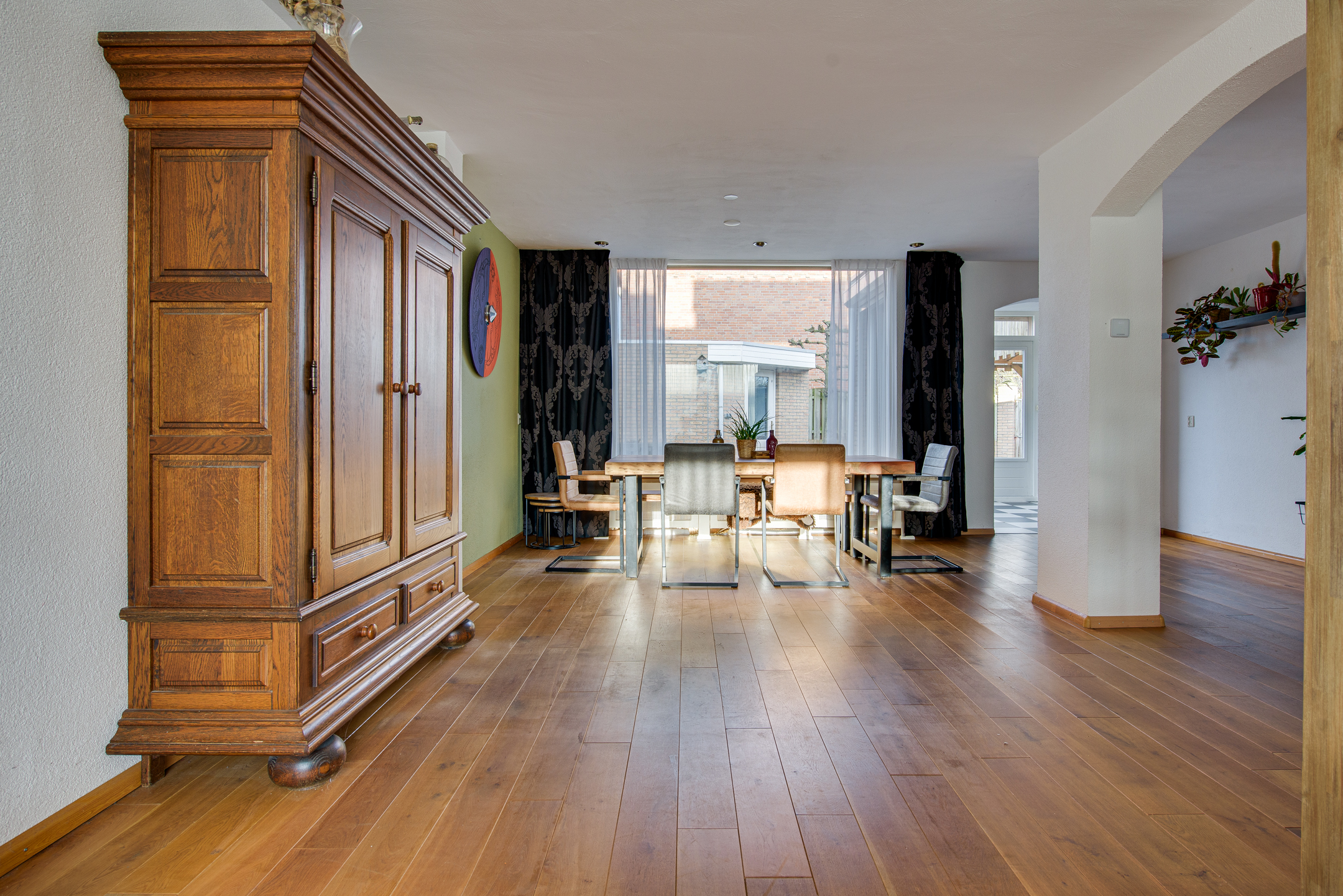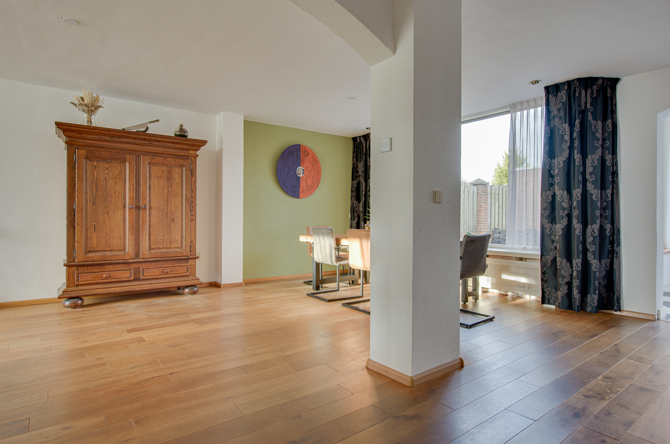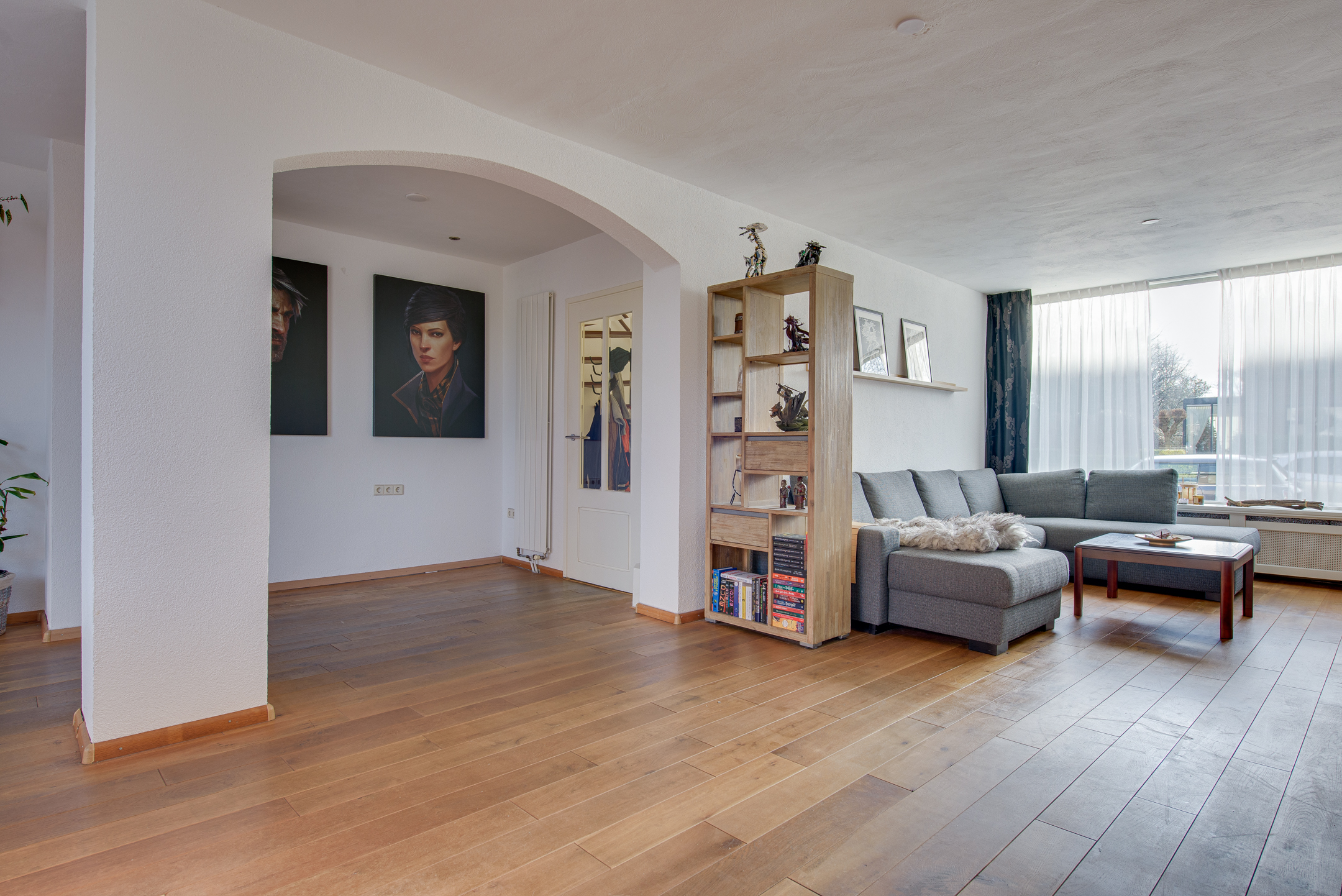 Als eerste betreden we de forse living, die door zijn omvang is in te delen in verschillende leefgebieden. De eikenhouten vloer vormt een echte eyecatcher! De verschillende doorkijkjes zorgen voor een speels effect en maakt het geheel extra huiselijk. De grote raampartijen aan de voor- en achterzijde zorgen voor een prettige lichtinval.