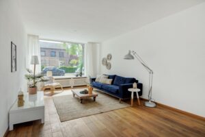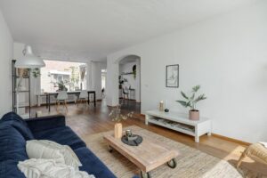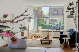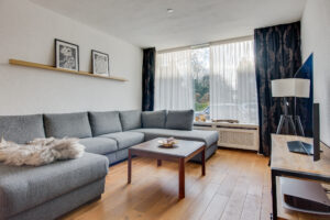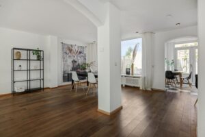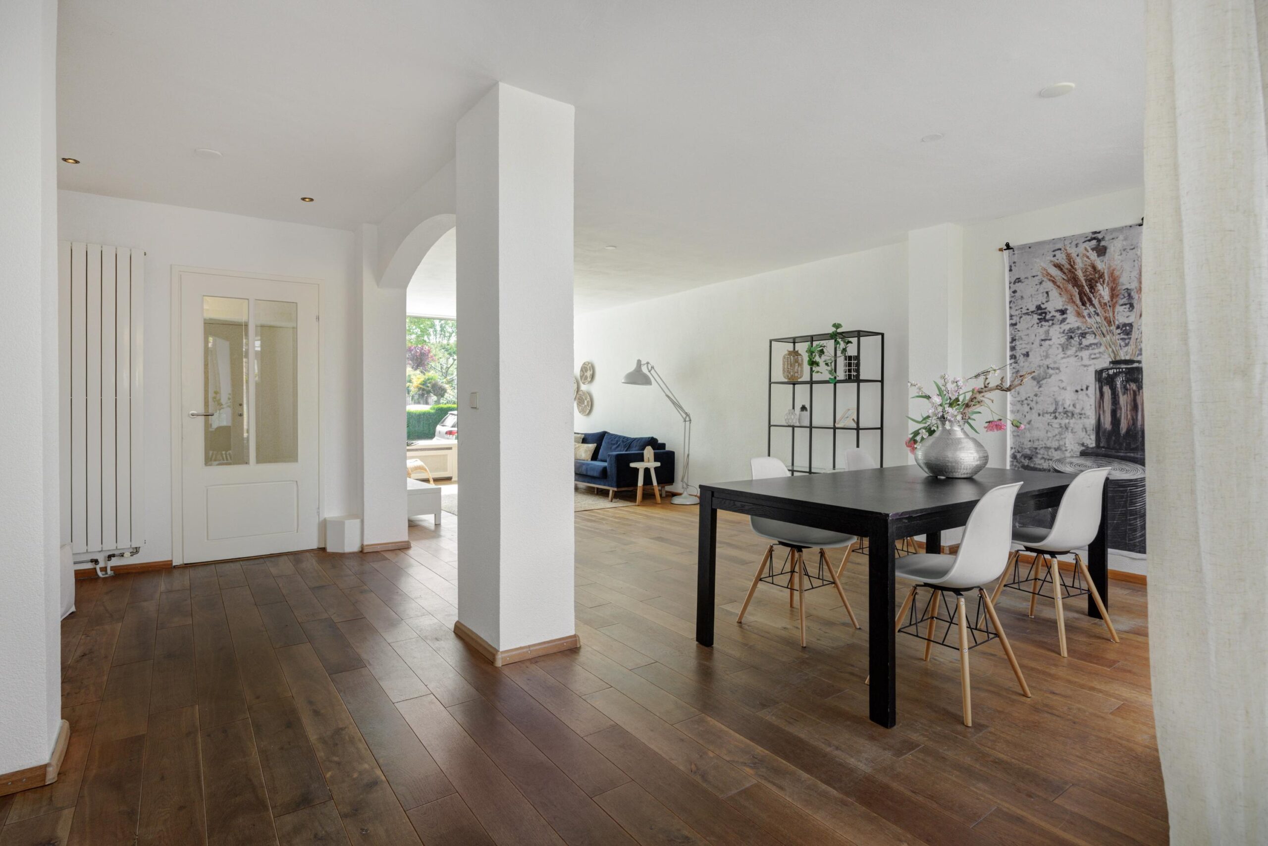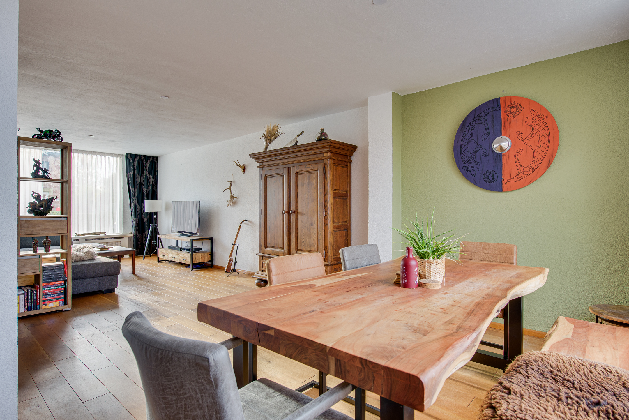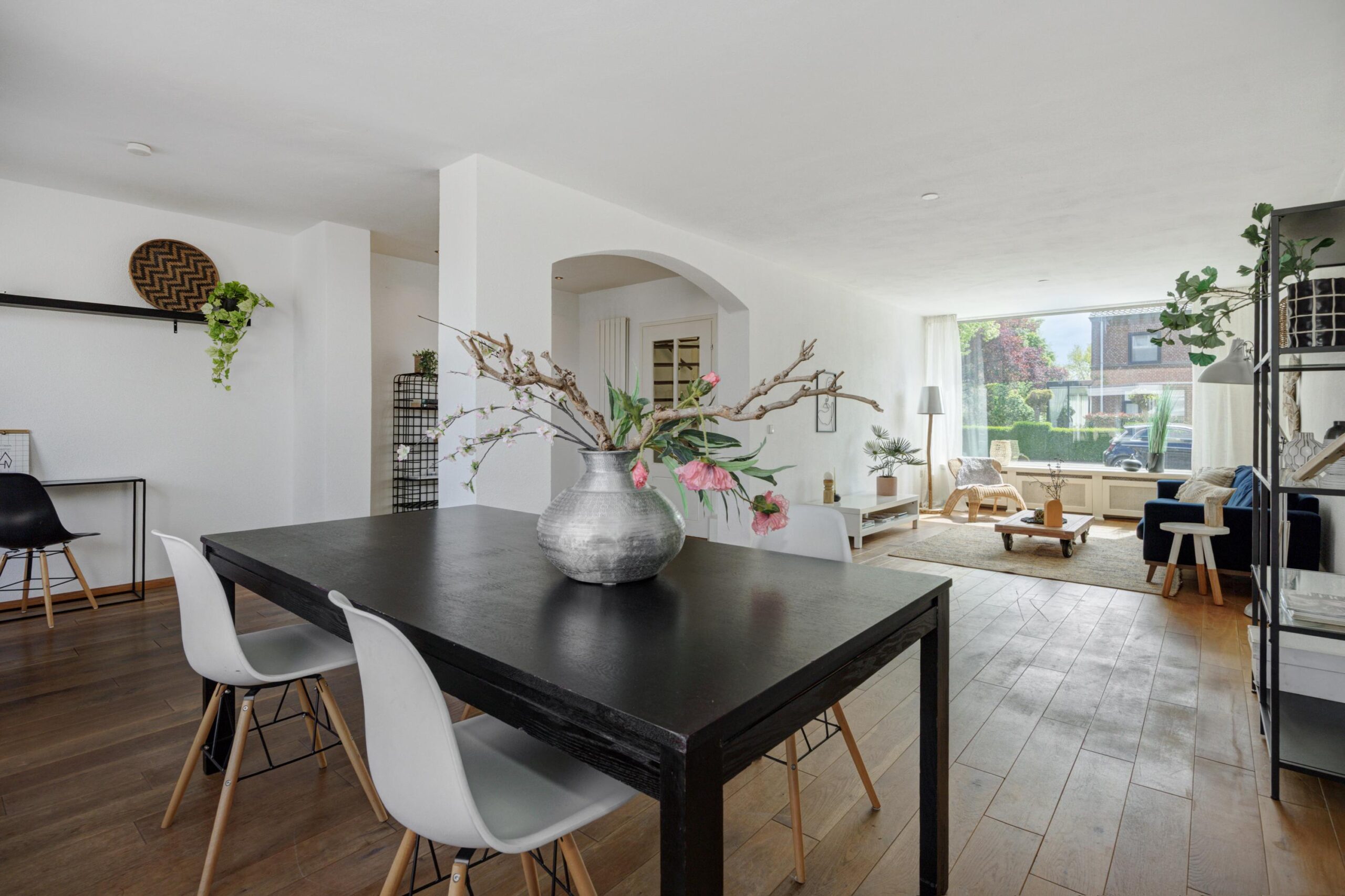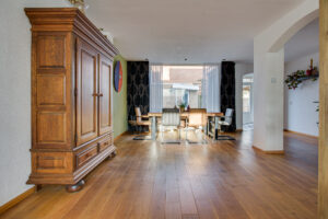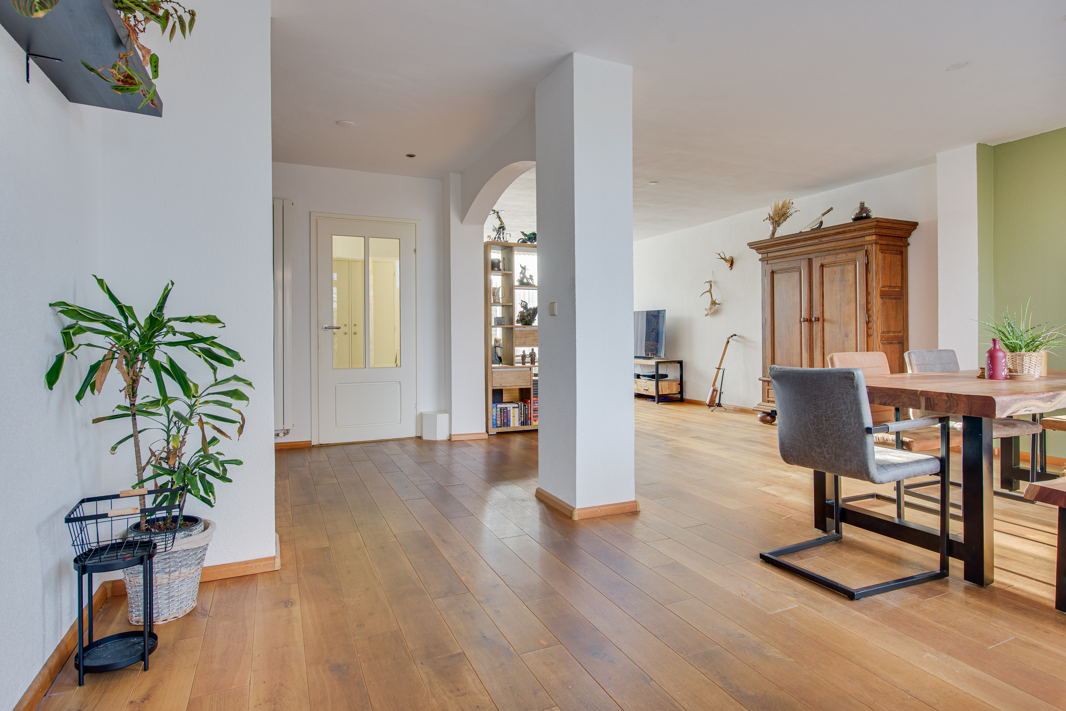 Als eerste betreden we de forse living, die door zijn omvang is in te delen in verschillende leefgebieden. De eikenhouten vloer vormt een echte eyecatcher! De verschillende doorkijkjes zorgen voor een speels effect en maakt het geheel extra huiselijk. De grote raampartijen aan de voor- en achterzijde zorgen voor een prettige lichtinval.