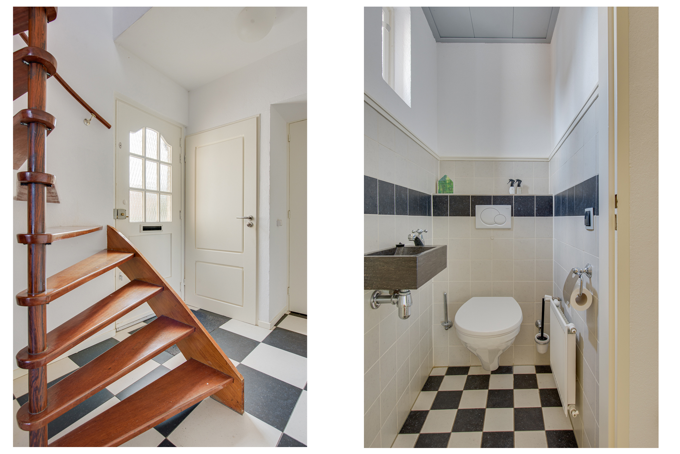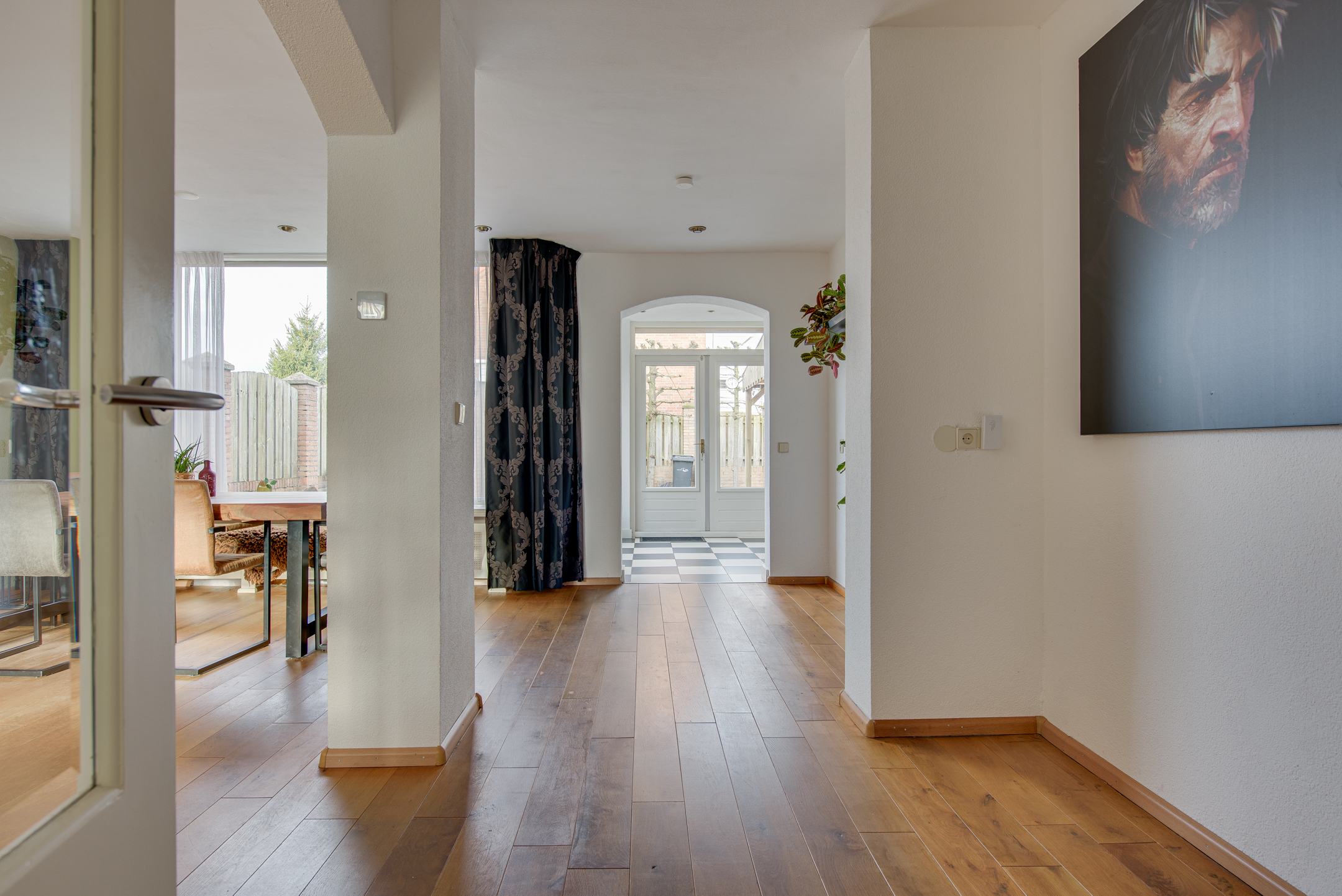 Via een ruime, eigen oprit betreden we de woning via de entree aan de zijkant. Wat direct opvalt, is de ruime hal met tegelvloer. Hier bevinden zich het toilet met wandcloset en fonteintje, de meterkast en de trapopgang naar de eerste verdieping.