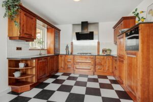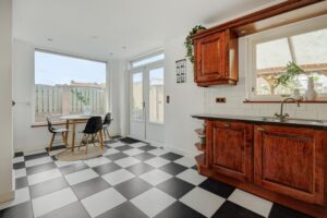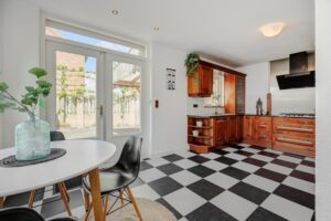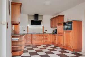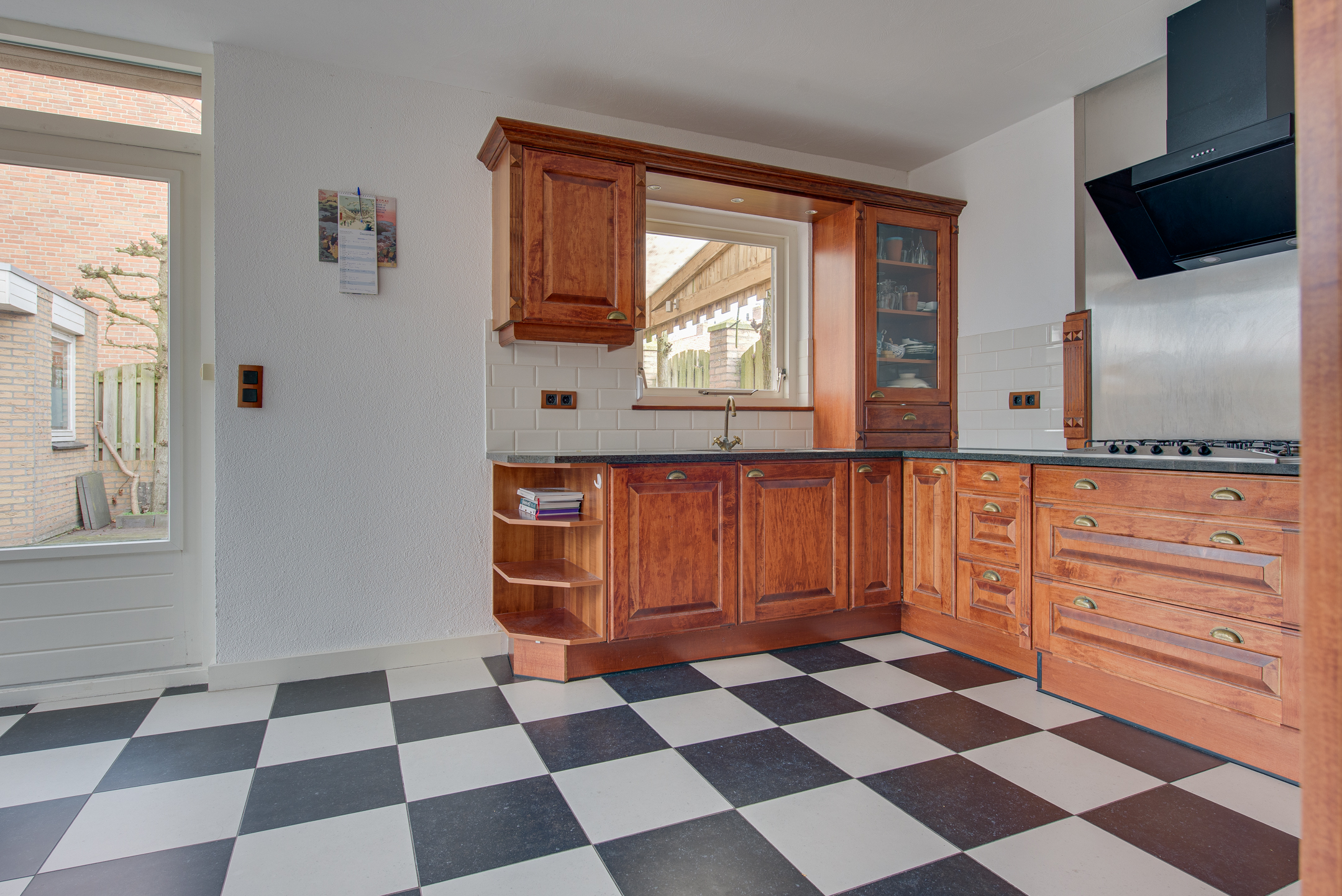 Eén van de bogen vormt de toegang naar de keuken. De keukenvloer is voorzien van dezelfde geblokte tegelvloer als in de hal, waarbij voor extra comfort ook vloerverwarming is aangebracht. De keuken die van twee kanten natuurlijke lichtinval heeft via de aanwezige ramen, kent een U-opstelling. De inbouwkeuken is voorzien van een granieten werkblad, vaatwasser, inbouwkoelkast, 5-pits Neff gasfornuis, afzuigkap (2020), combi oven/magnetron en twee carrouselkasten.