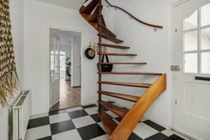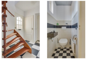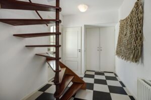 Terug in de hal gaan we via de fraaie open, houten trap naar de eerste verdieping.