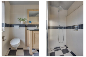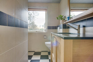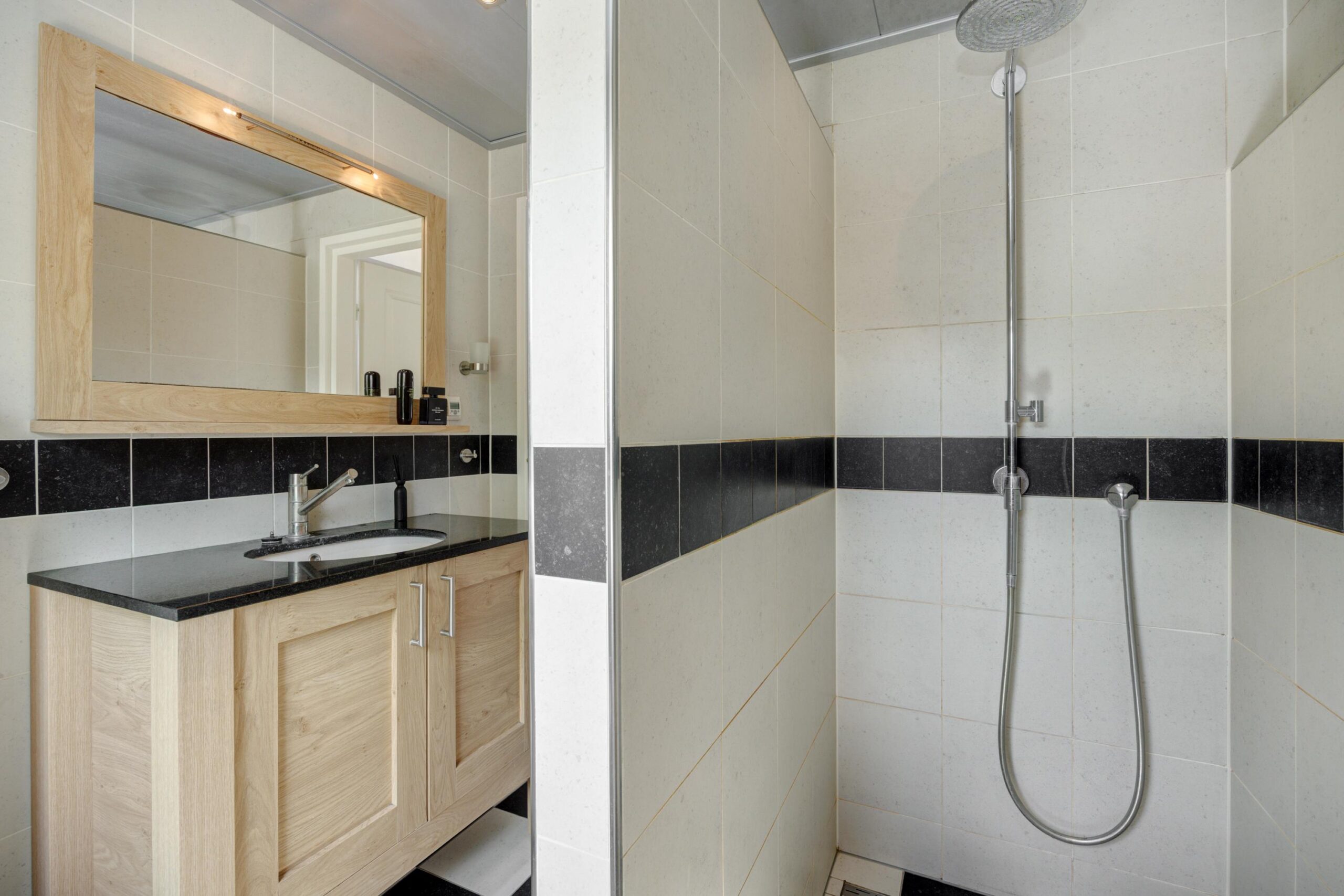 Tenslotte bereiken we de betegelde badkamer met vloerverwarming en het volgende sanitair: inloopdouche met regendouche, een badmeubel met spiegel, een wandcloset en designradiator. Het geheel wordt sfeervol omlijst door inbouwspots. Een gevelraam zorgt voor een natuurlijke lichtinval.