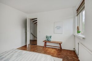 We bereiken de eerste verdieping waar – uitkomend op een overloop – zich 3 slaapkamers en een badkamer bevinden. De gehele verdiepingsvloer – met uitzondering van de badkamer – is afgewerkt met een traditionele houten parketvloer.