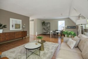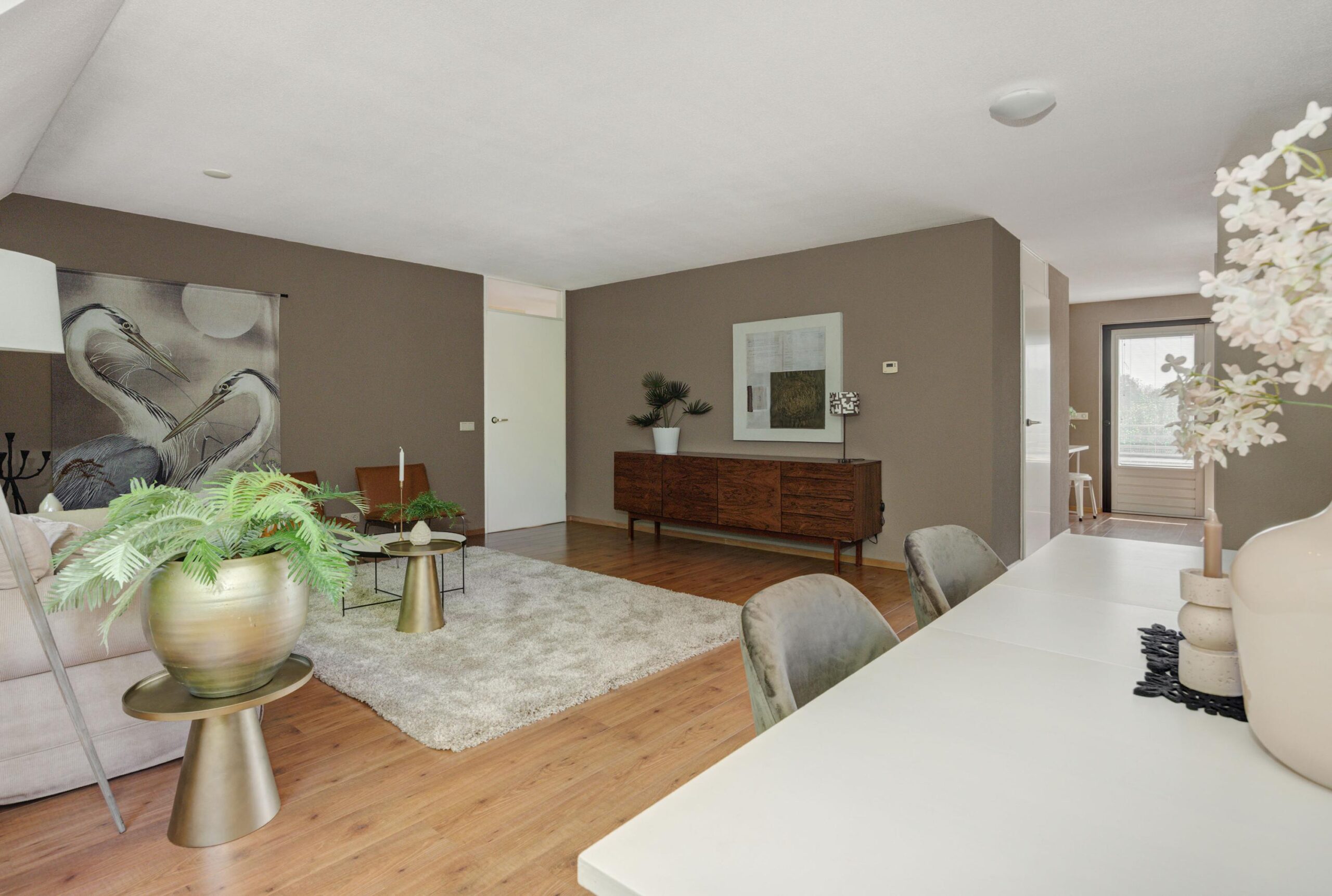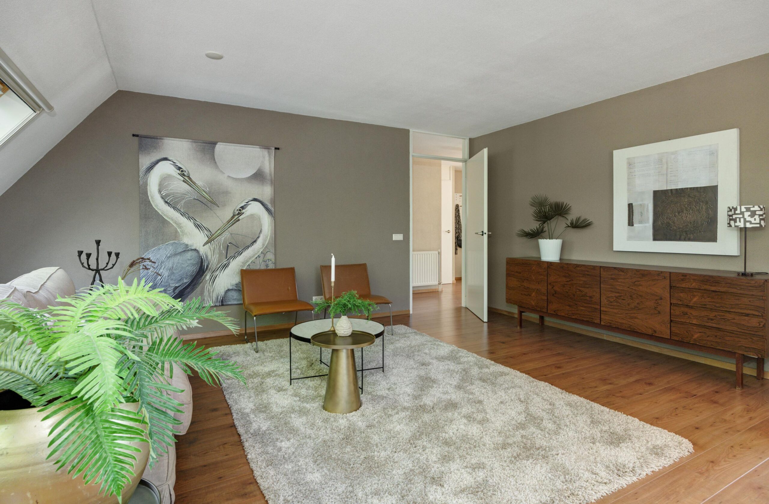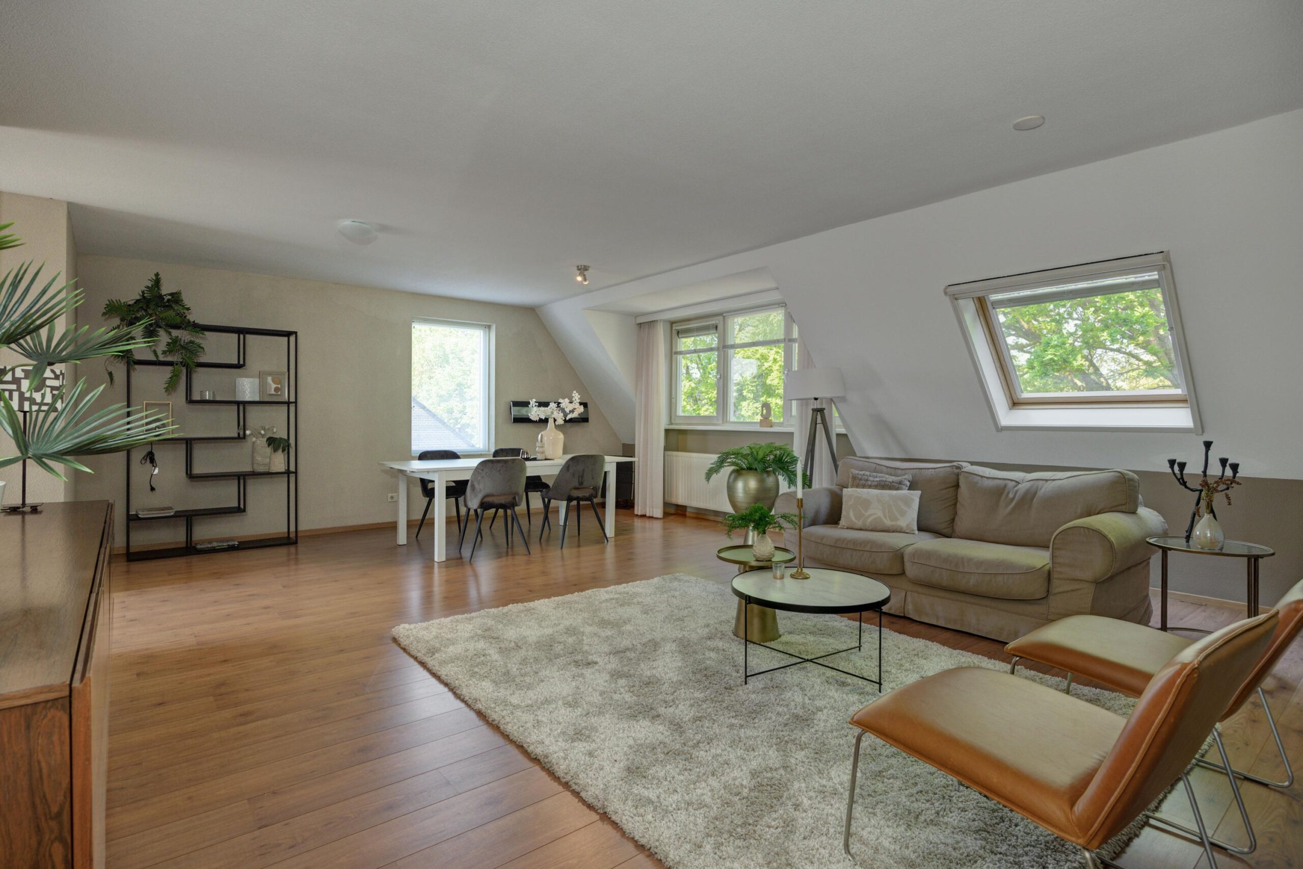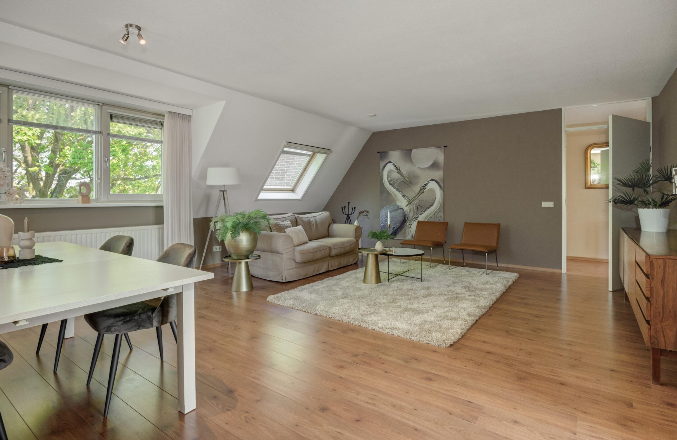 Bij binnenkomst treft u een royale hal die toegang biedt tot bijna alle vertrekken. De woonkamer is ruim en geniet van een fijne lichtinval dankzij de dakkapel, een zijraam en een Velux dakraam (voorzien van luxaflex en hor). De living is afgewerkt met een laminaatvloer.