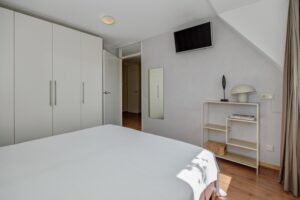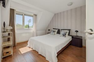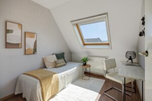 Het appartement beschikt over twee slaapkamers aan de achterzijde. De hoofdslaapkamer is ruim, beschikt over een dakkapel met rolluik en biedt voldoende ruimte voor een grote kastenwand. De tweede slaapkamer is prima geschikt als werk- of logeerkamer en is voorzien van een Velux dakraam met hor en verduistering.