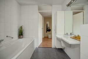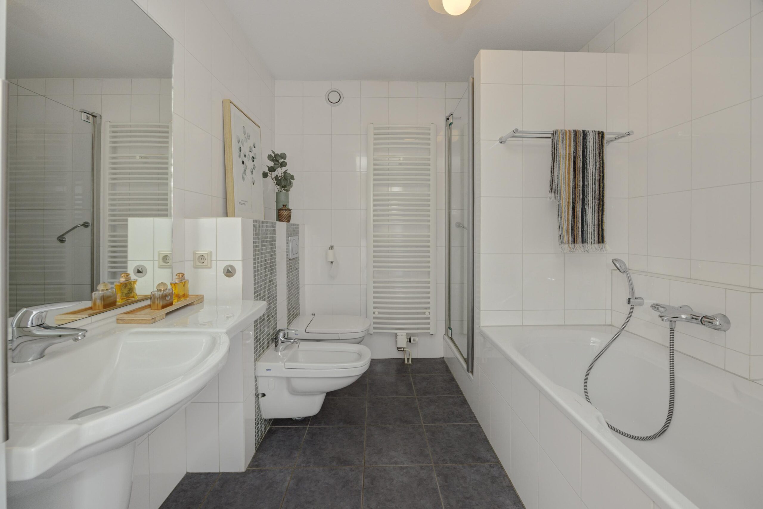 De badkamer is volledig licht betegeld en ingericht met een ligbad, een aparte douche, wastafelmeubel, een tweede toilet en bidet. Daarnaast is er een separaat gastentoilet in de hal aanwezig.