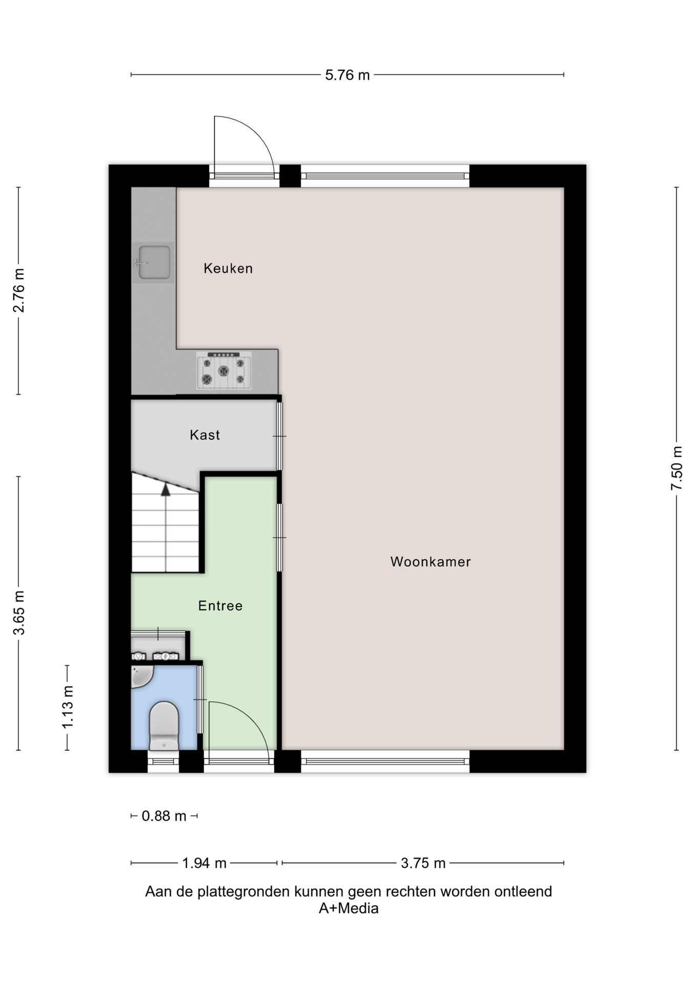 Via de entree komen we in de hal met toegang tot het toilet, de meterkast en de trap naar de eerste verdieping.