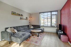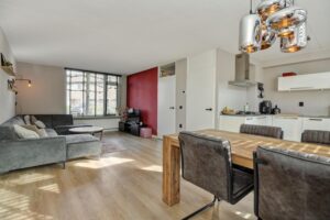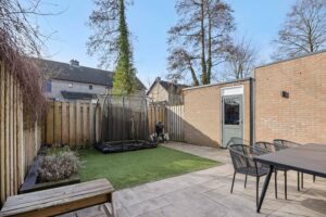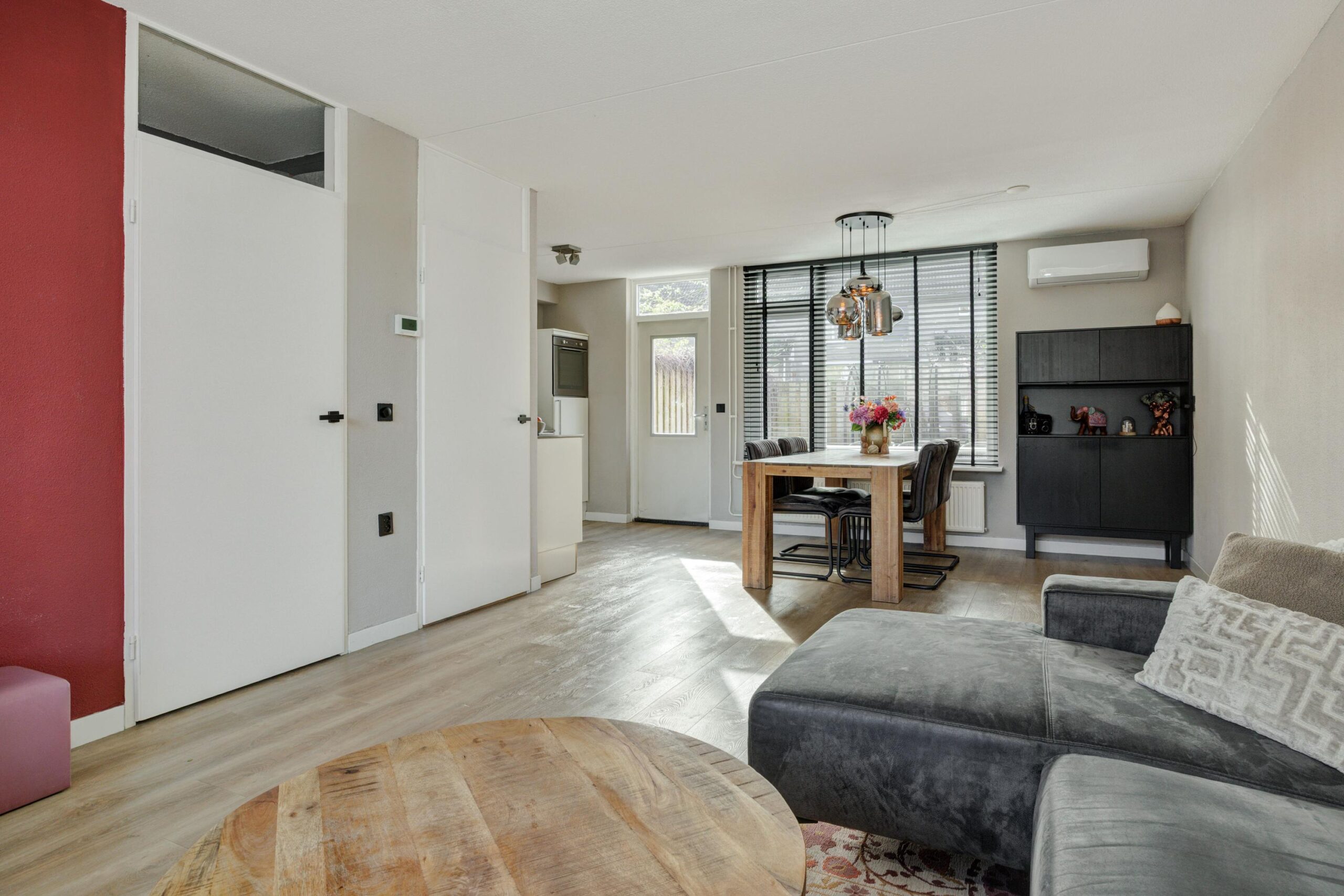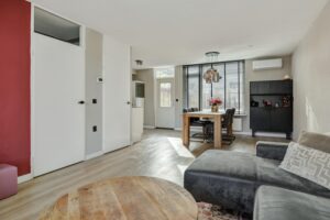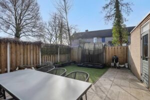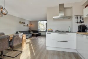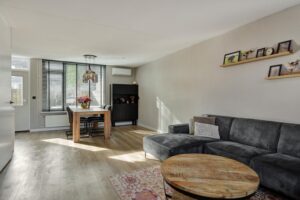 De woonkamer is licht en ruim en heeft een prettige verbinding met de tuin. De begane grond is in 2023 voorzien van een sfeervolle PVC vloer. De trapkast zorgt voor veel opbergcapaciteit.