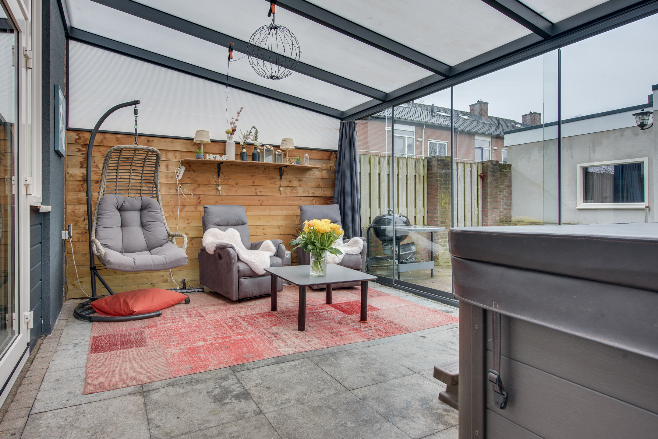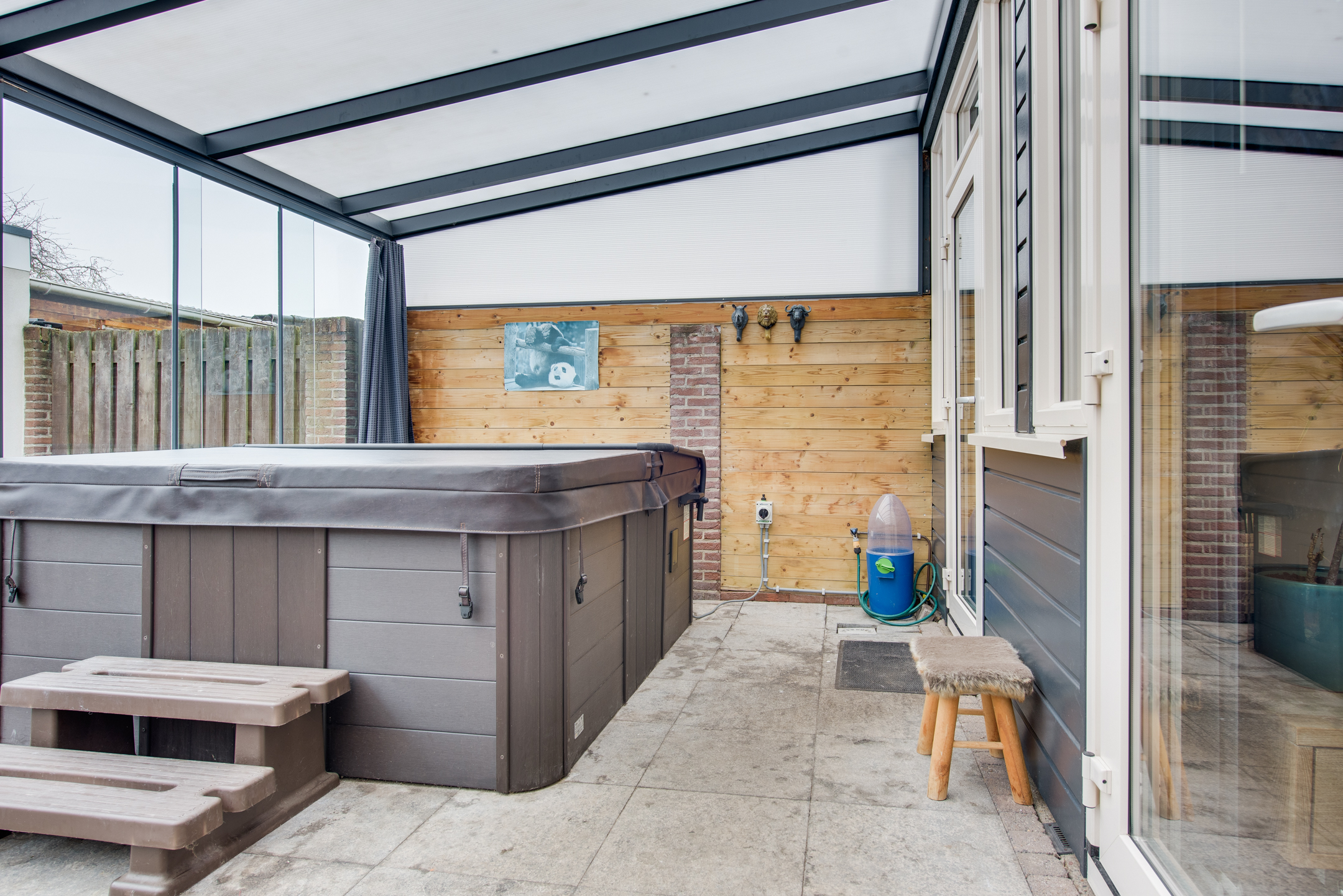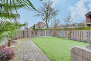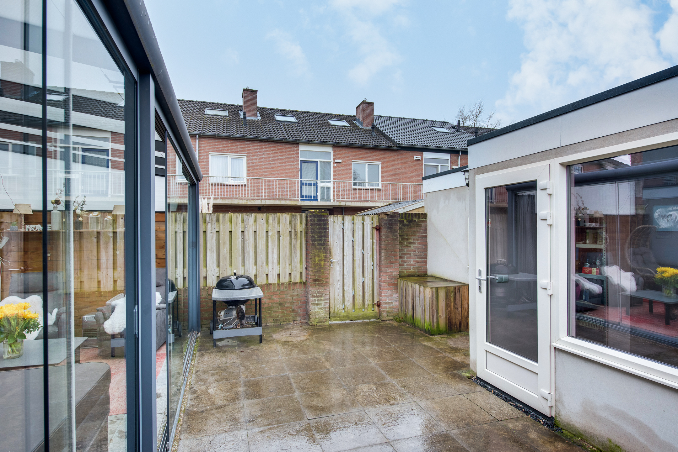 De zonnige achtertuin, met achterom via de zijkant van de woning, is gelegen op het zuidwesten. De tuin is voorzien van sierbestrating. Aan de woning is een serre-aanbouw geplaatst met glazen schuifwanden. De serre is voorzien van elektra. Een fijne, compacte tuin!