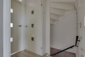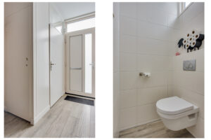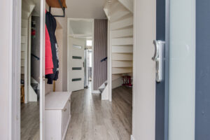 Via de voortuin en de entree aan de voorzijde van de woning bereiken we de hal met vernieuwde meterkast (met krachtstroom), toiletruimte (met wandcloset) en trapopgang naar de eerste verdieping. Vanuit de hal is er toegang tot de woonkamer en de keuken.