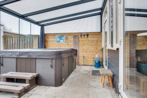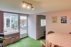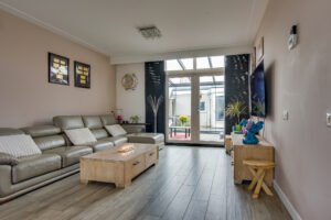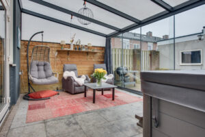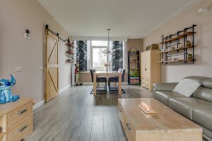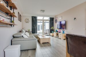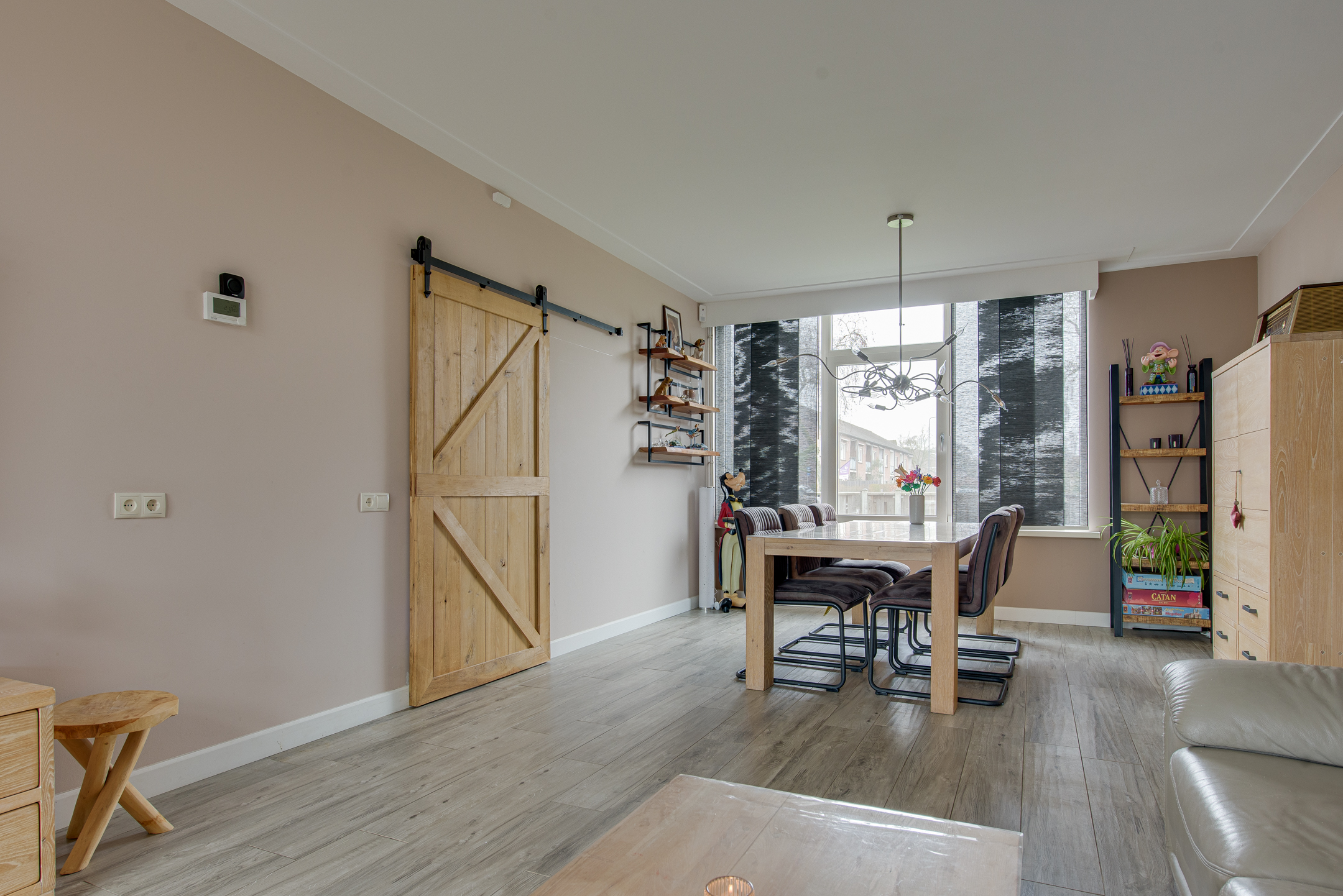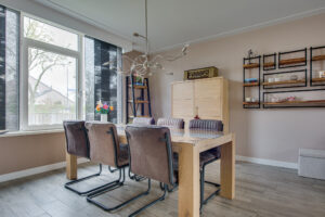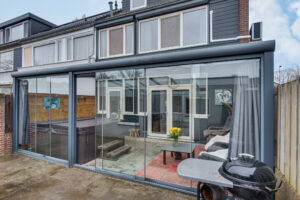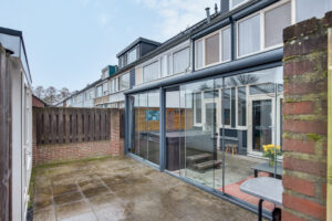 Bij binnenkomst in de ruime woonkamer valt direct de heerlijke ruimte met de grote raampartijen aan de voor- en achterzijde op. Aan de voorzijde kijk je vrij de straat in. Via openslaande deuren is er toegang tot de serre-aanbouw.