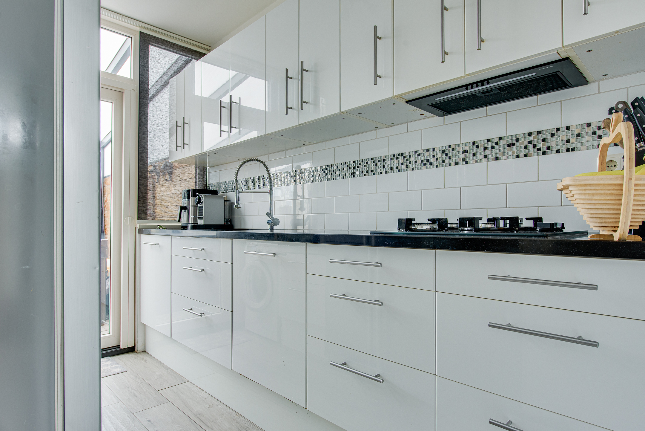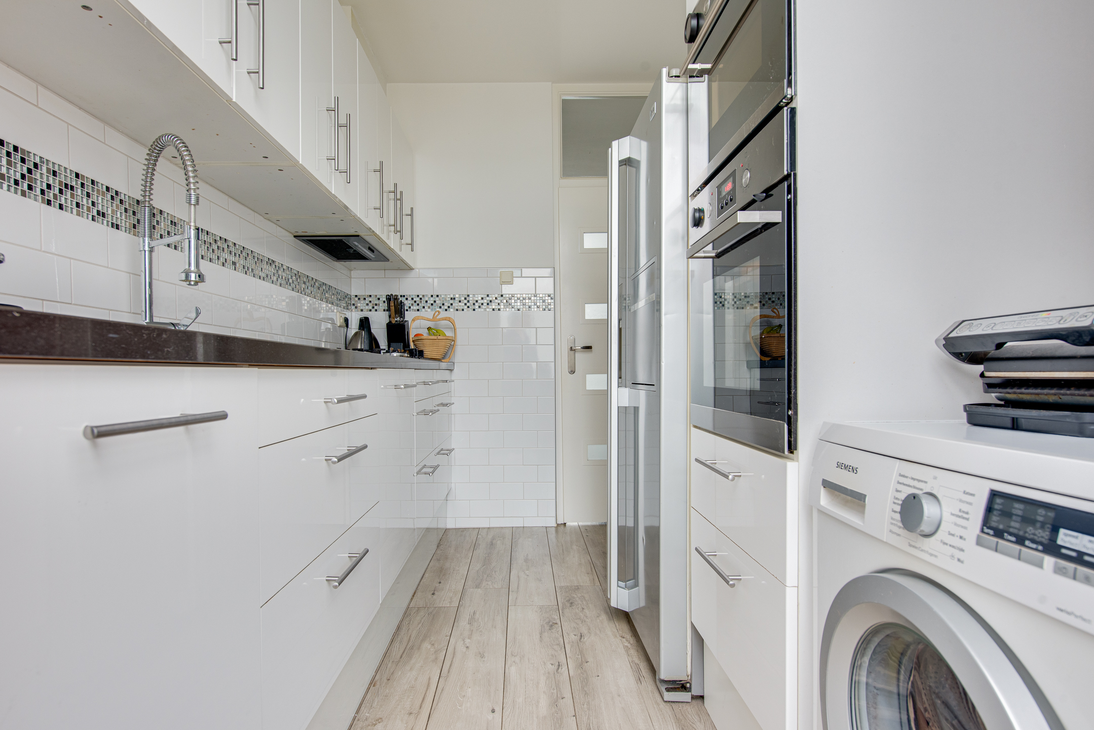 Terug in de hal lopen we door naar de dichte keuken met deur naar de serre/achtertuin. De ruime keuken, met composiet aanrechtblad, is voorzien van een spoelbak, vaatwasmachine, 4-pits gaskookplaat, afzuigkap, Amerikaanse koel-/vriescombinatie, oven, combimagnetron, opbergruimte in de kasten en wasmachine aansluiting.
