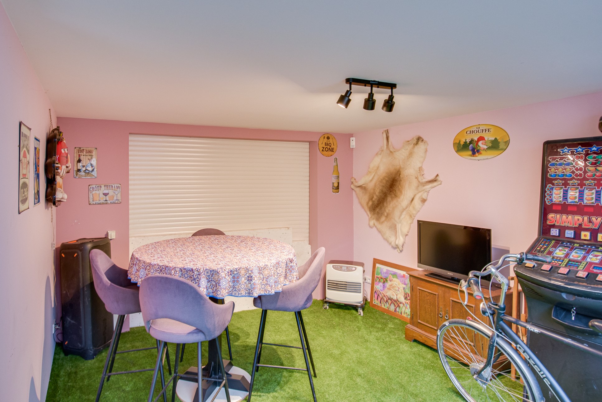 Achterin de tuin is de grote vrijstaande berging gesitueerd. Deze berging is gesplitst in 2 delen, een multifunctionele ruimte en een berging. Het multifunctionele gedeelte is voorzien van elektra en een rolluik naar de straat en een (loop)deur naar de tuin.