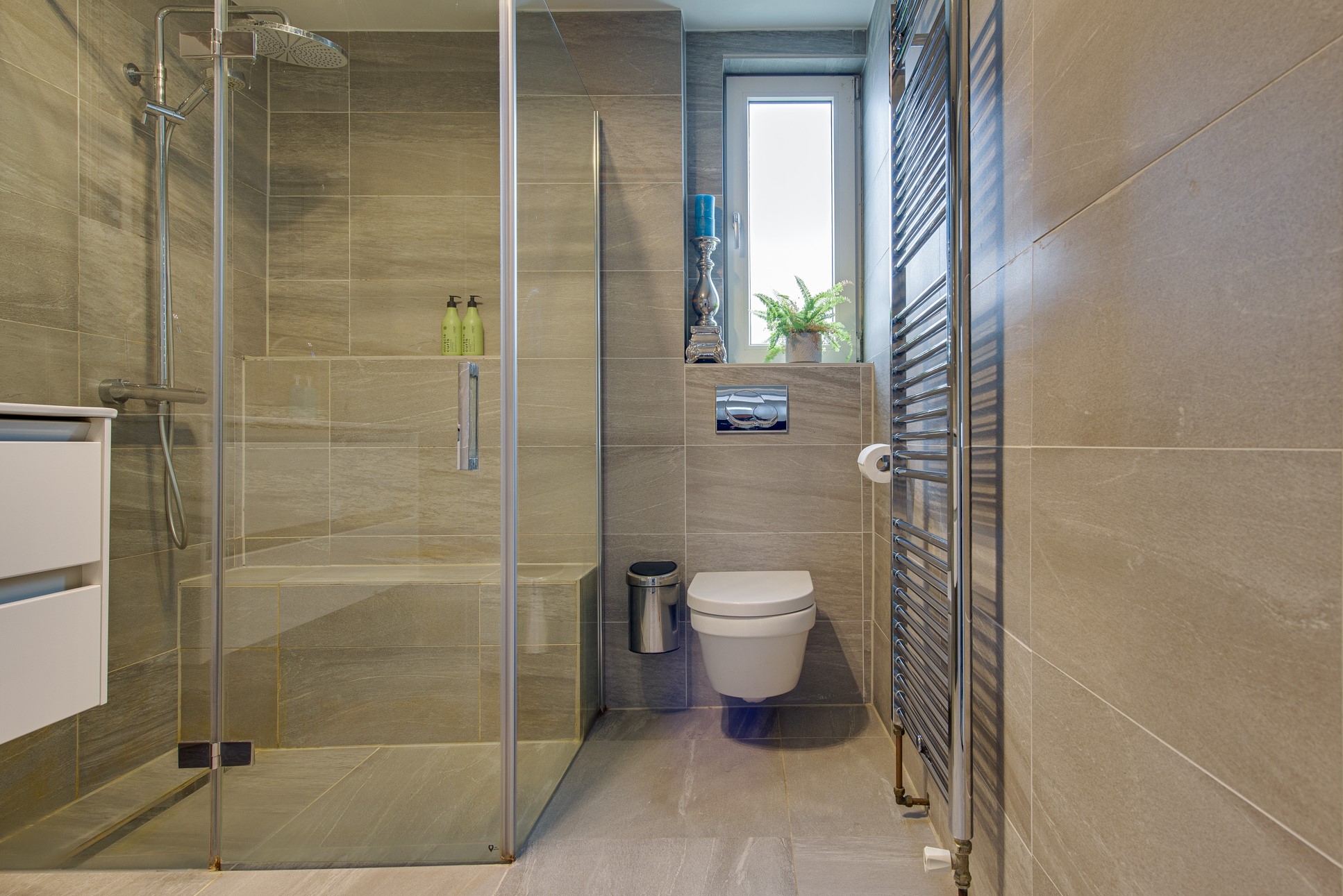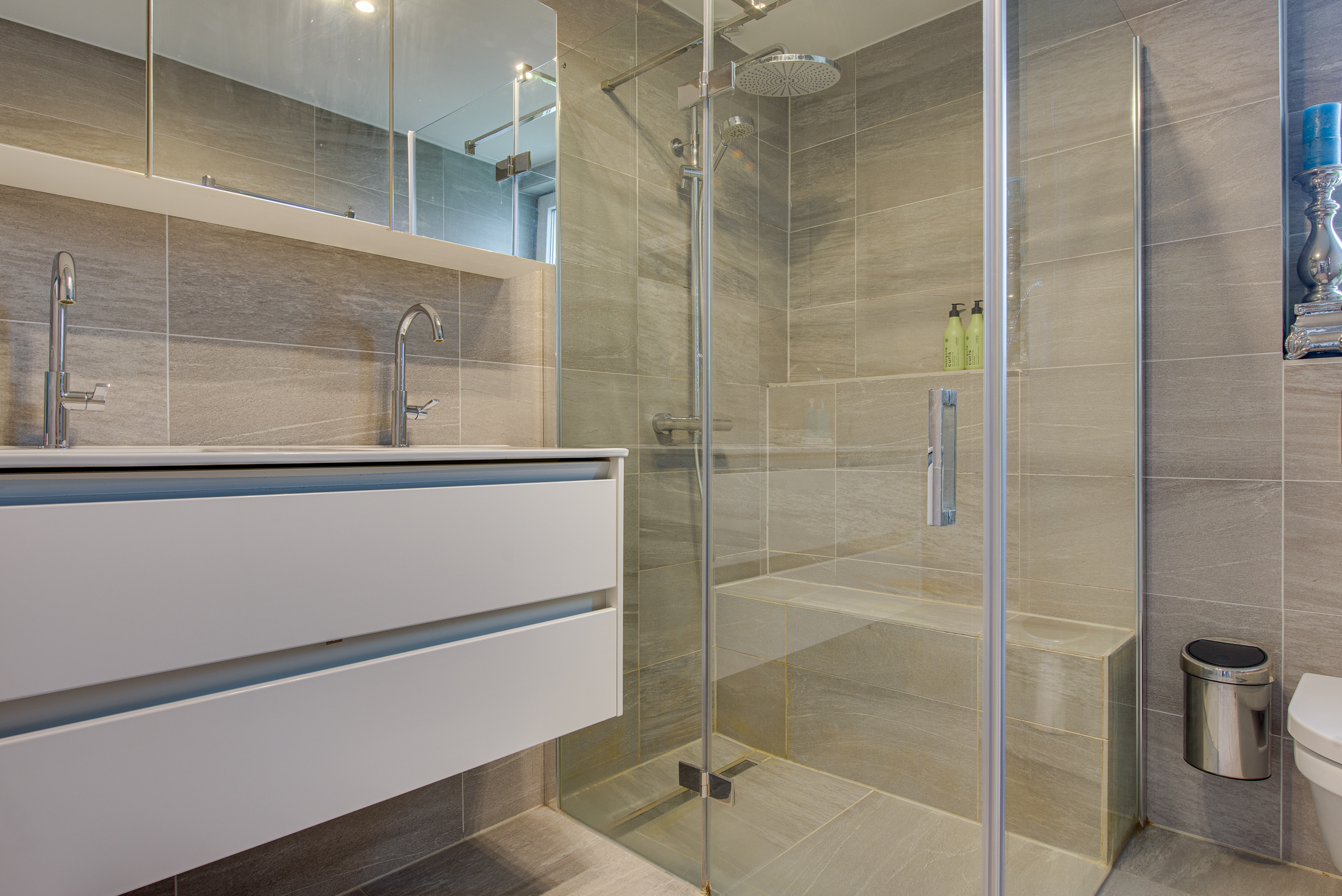 Terug op de overloop lopen we door naar de moderne badkamer aan de voorzijde van de woning. De badkamer is heerlijk ruim en voorzien van een grote inloopdouche met regendouche, dubbele wastafel met meubel, spiegelkast, wandcloset, designradiator en ingebouwde radio. De badkamer is volledig betegeld met een grijze vloer- en wandtegel.