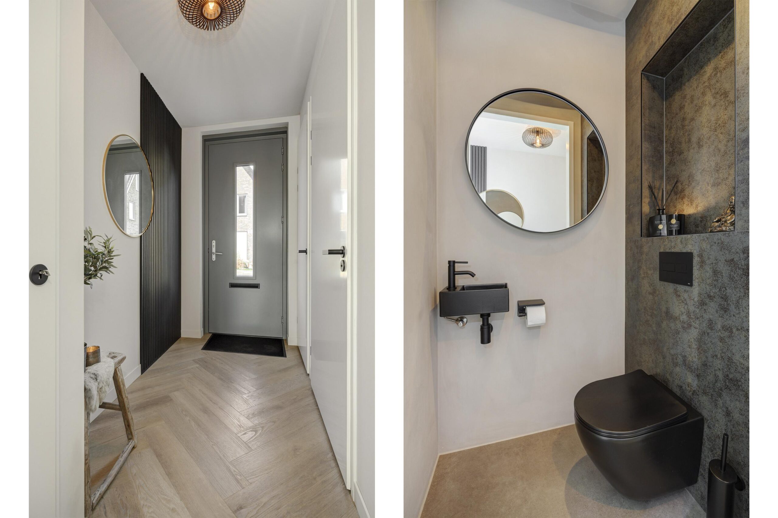 Via de entree betreedt u de hal met de meterkast (met waterontharder), toiletruimte, garderobe en trapopgang naar de eerste verdieping. De gehele begane grond is voorzien van comfortabele vloerverwarming met een visgraat PVC vloer en strak afgewerkte wanden en plafonds.