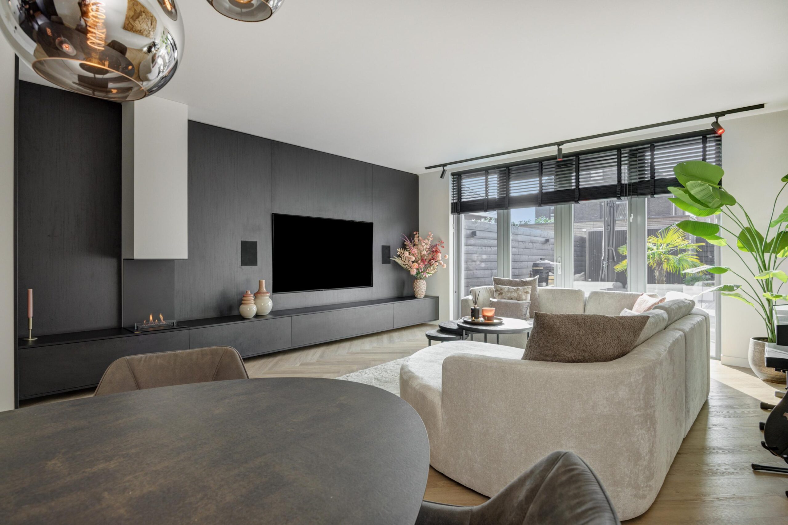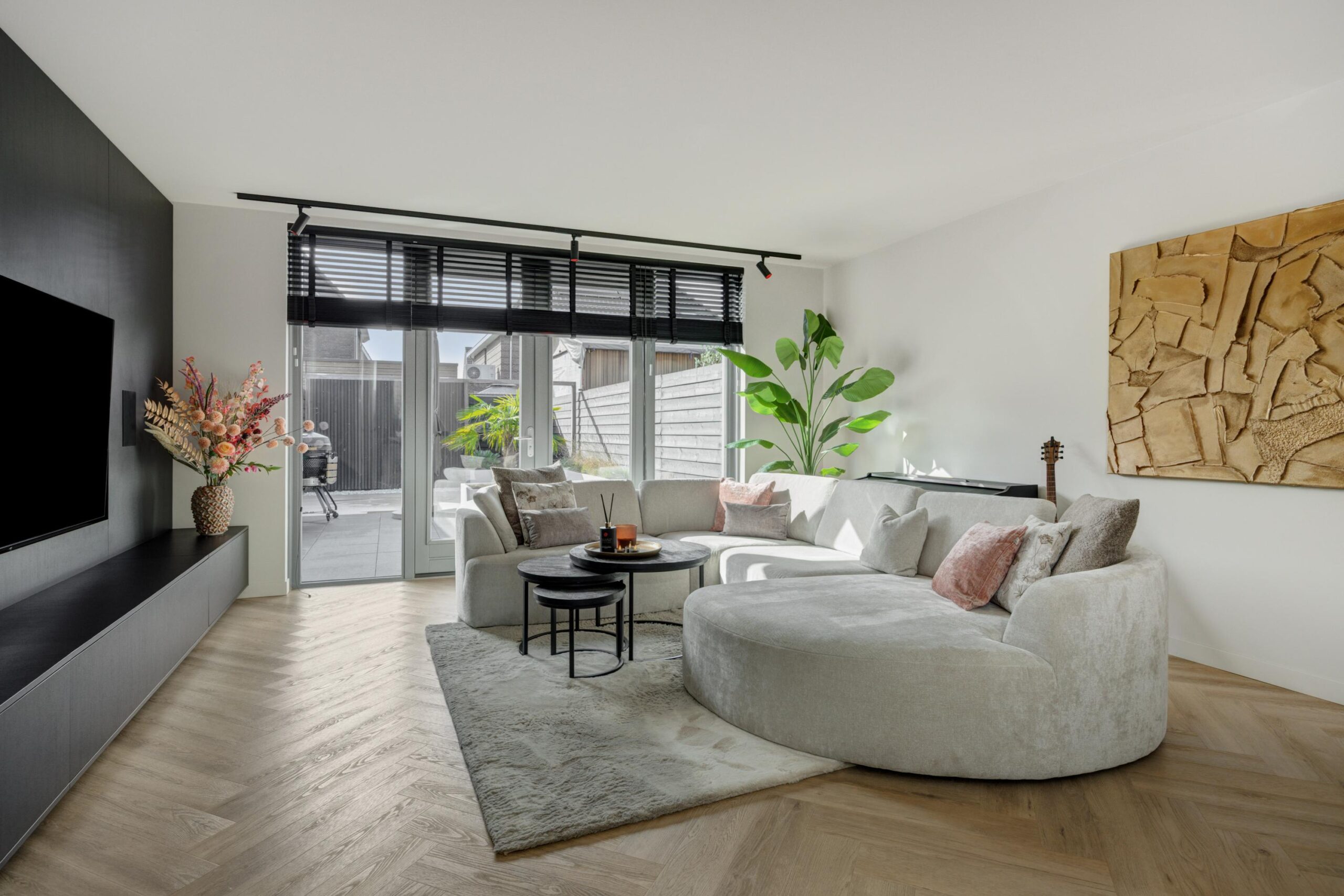 De hoogwaardige afwerking valt direct op: strak stucwerk, stijlvolle PVC vloeren (visgraat op de begane grond en eerste verdieping), een luxe designkeuken met hoogwaardige inbouwapparatuur, een sfeervolle woonkamer met propaanhaard en openslaande deuren naar de fraai aangelegde tuin op het zuidwesten mét bewateringssysteem.