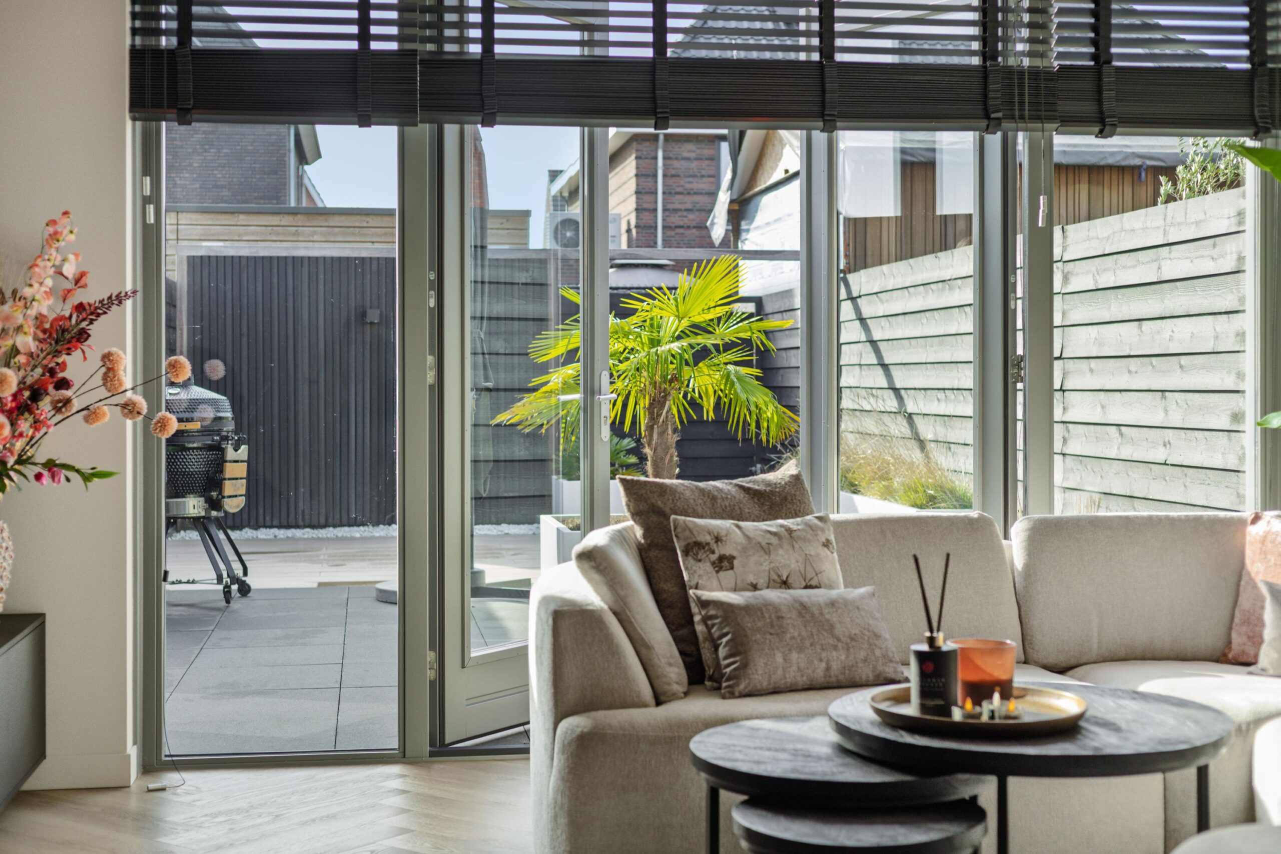 De tuingerichte woonkamer is ruim en licht, met openslaande deuren naar de zonnige achtertuin. De sfeervolle propaanhaard vormt een warme eyecatcher en maakt de ruimte extra comfortabel tijdens de koudere maanden. Dankzij de grote raampartijen geniet u hier van veel natuurlijk lichtinval en een fijne verbinding met buiten.