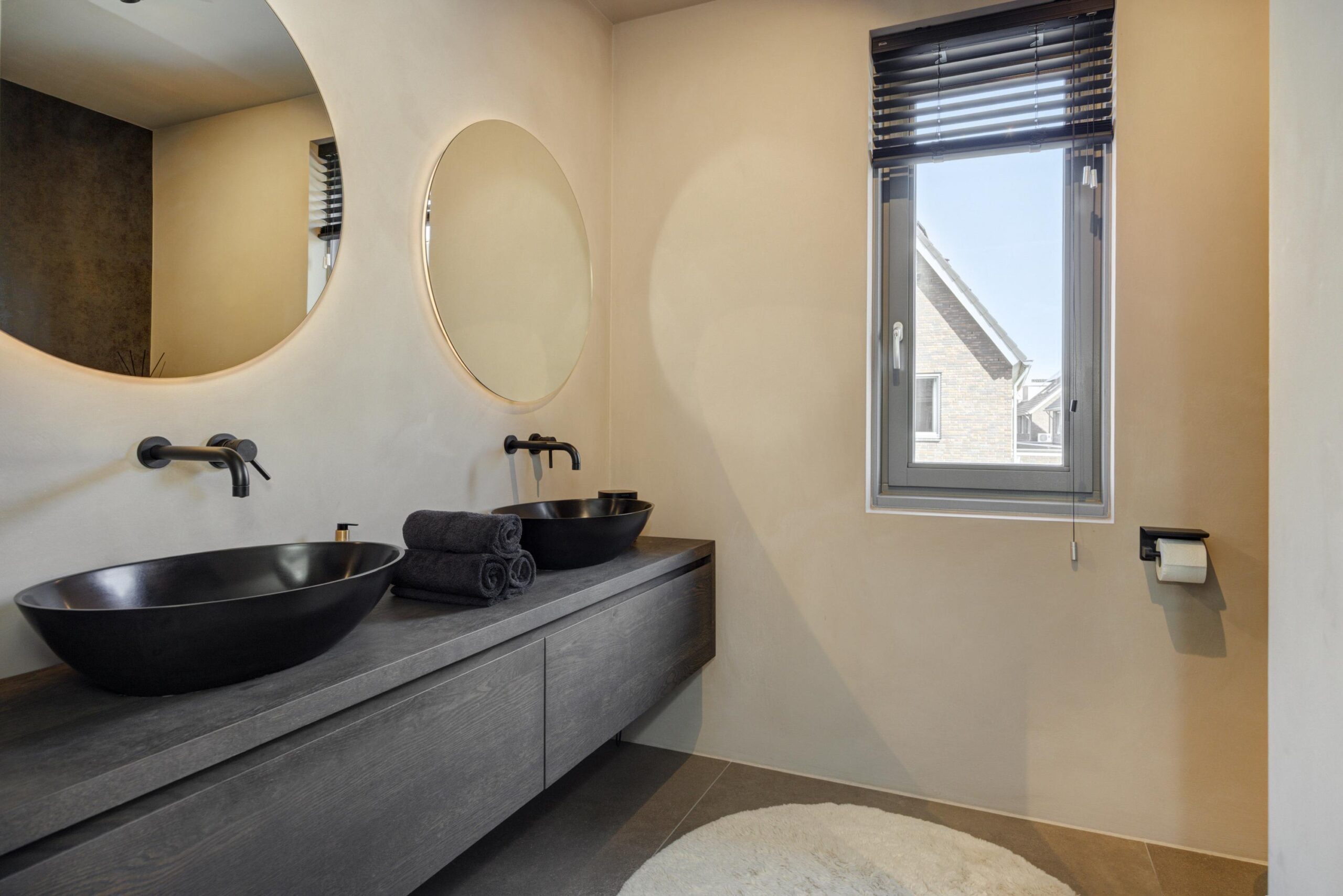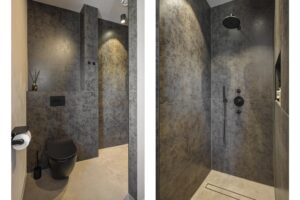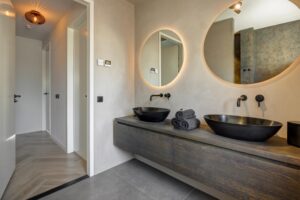 De badkamer is hoogwaardig uitgevoerd door Stone Company en straalt luxe en kwaliteit uit. Voorzien van vloerverwarming, toilet, een dubbele wastafel met twee waskommen en een ruime inloopdouche is dit een comfortabele en stijlvolle ruimte.