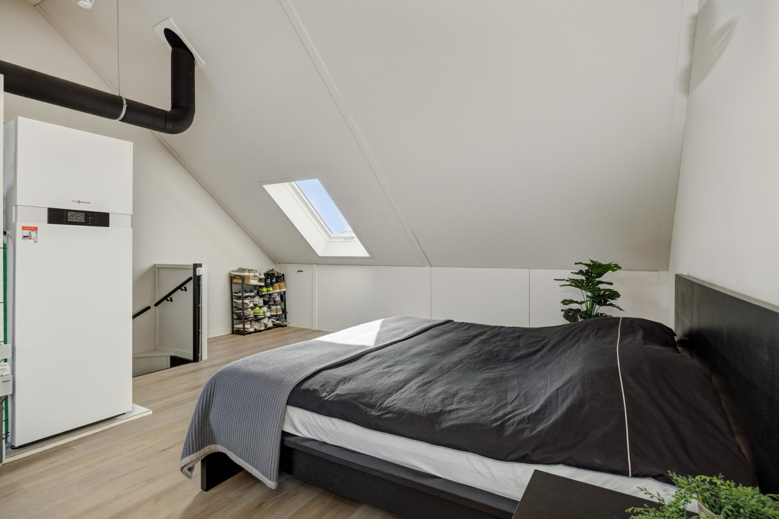 De zolderverdieping is momenteel een open, multifunctionele ruimte. Hier bevinden zich de WTW-unit, de lucht/water warmtepomp en de aansluitingen voor wasmachine en droger. Ook deze verdieping is voorzien van vloerverwarming met een rechte PVC vloer.