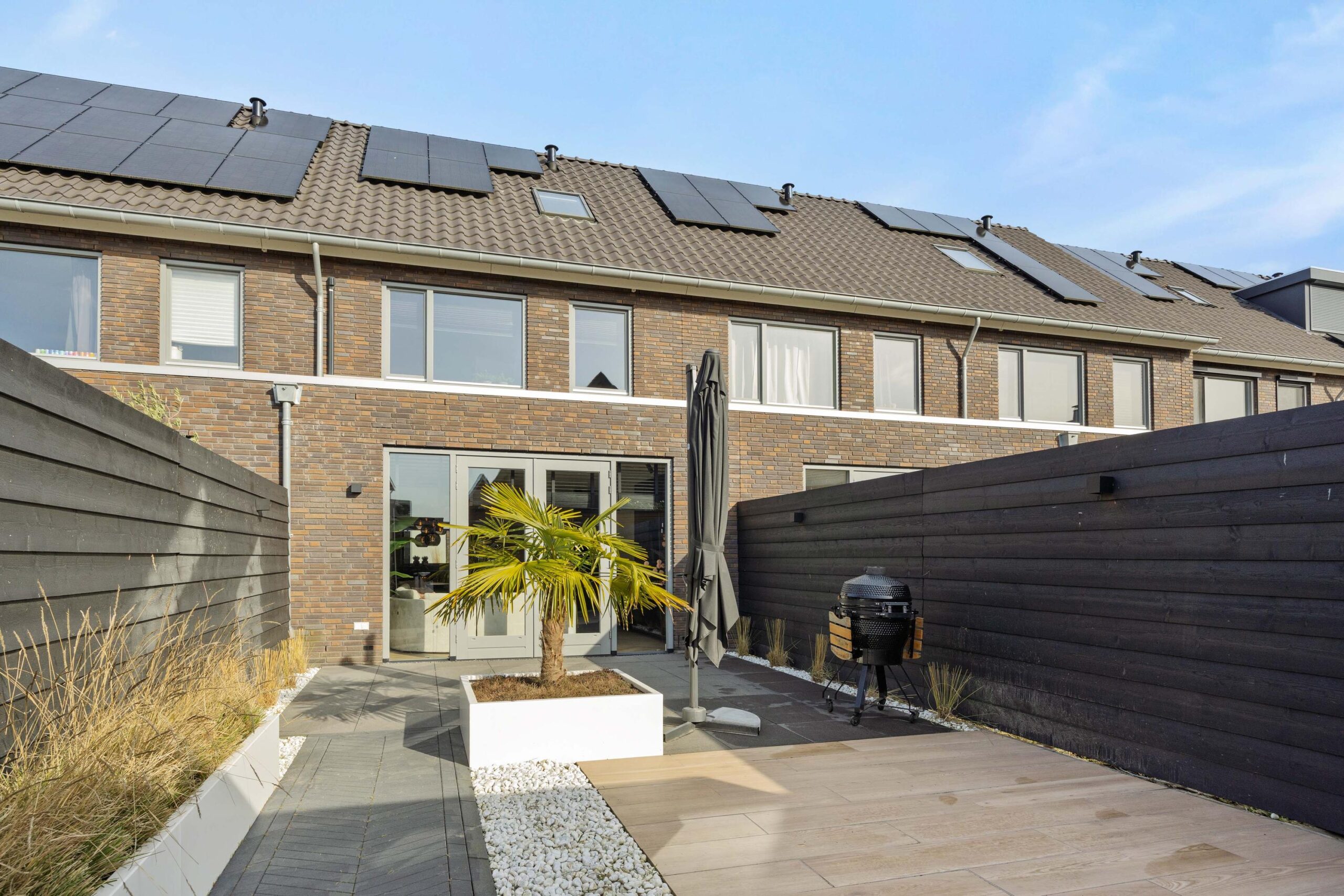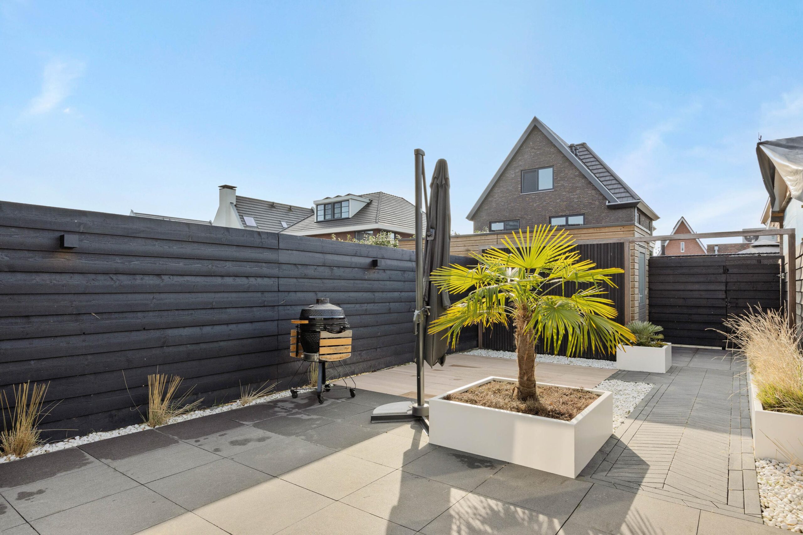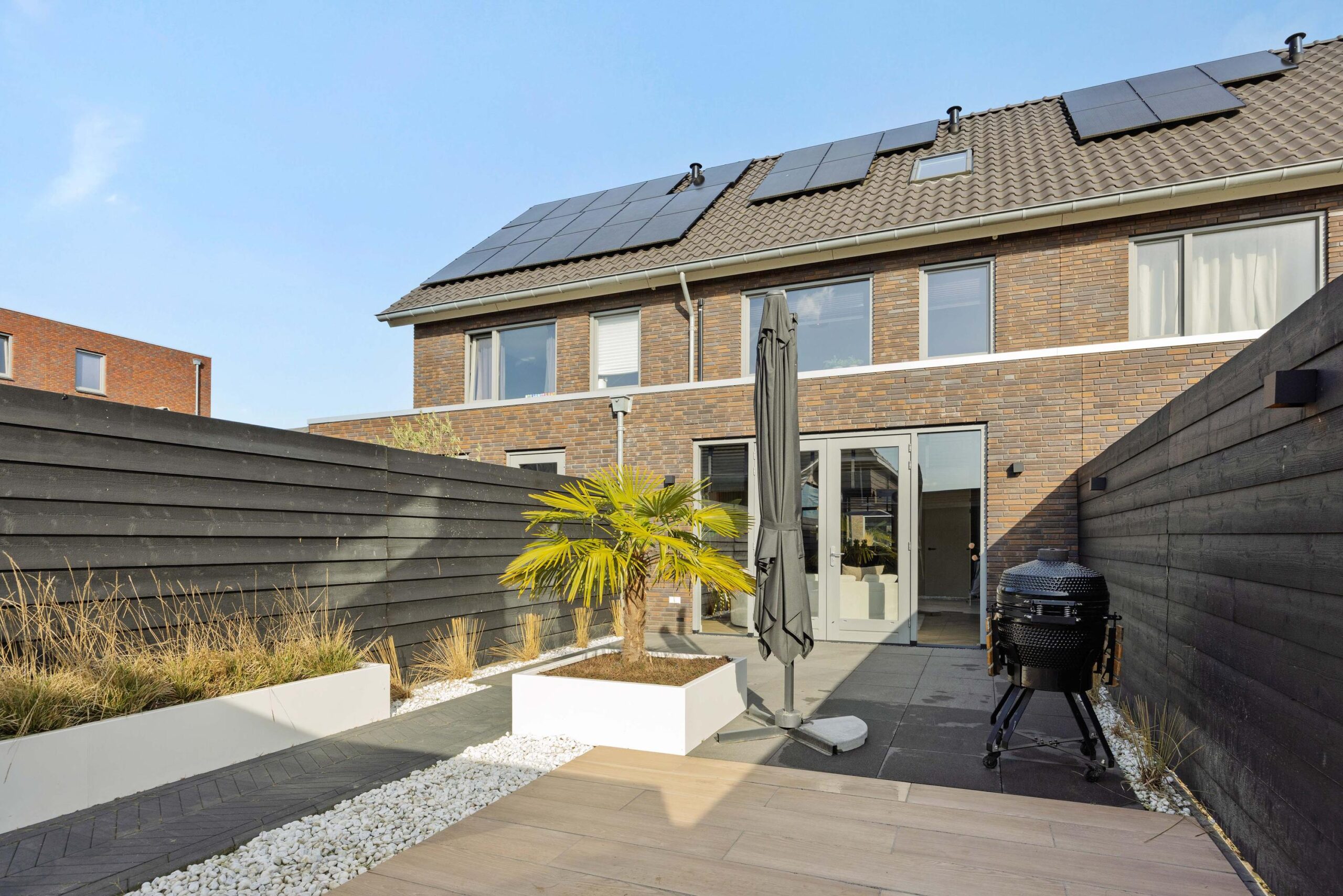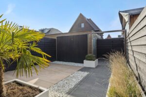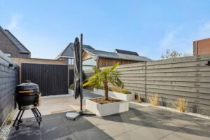 De achtertuin is stijlvol aangelegd, gelegen op het zonnige zuidwesten en voorzien van een bewateringssysteem – ideaal voor optimaal tuincomfort en lange zomerse avonden in de zon.