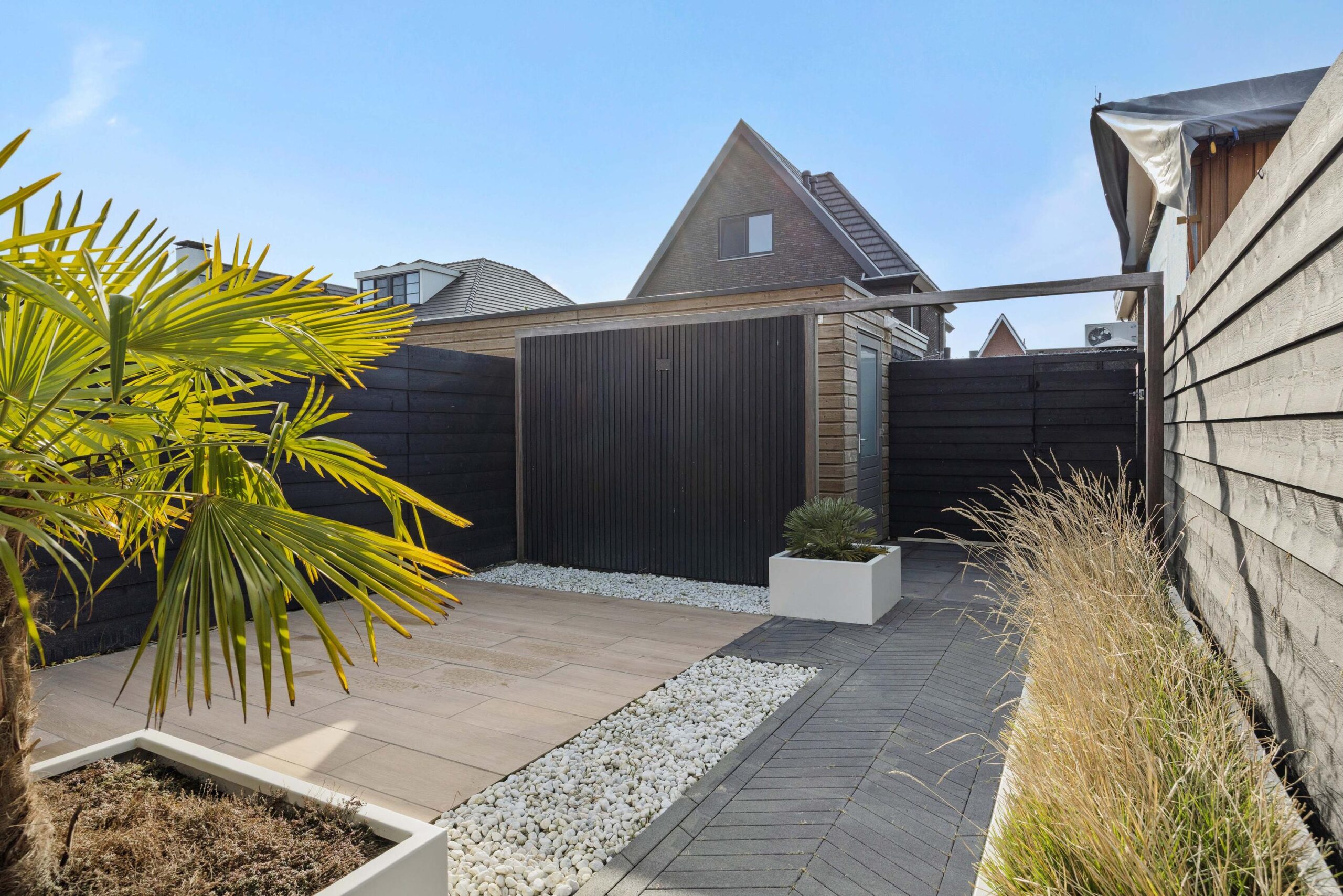 De houten berging is voorzien van elektra en beschikt over veel opbergcapaciteit. De poort geeft toegang tot de achtergelegen brandgang.